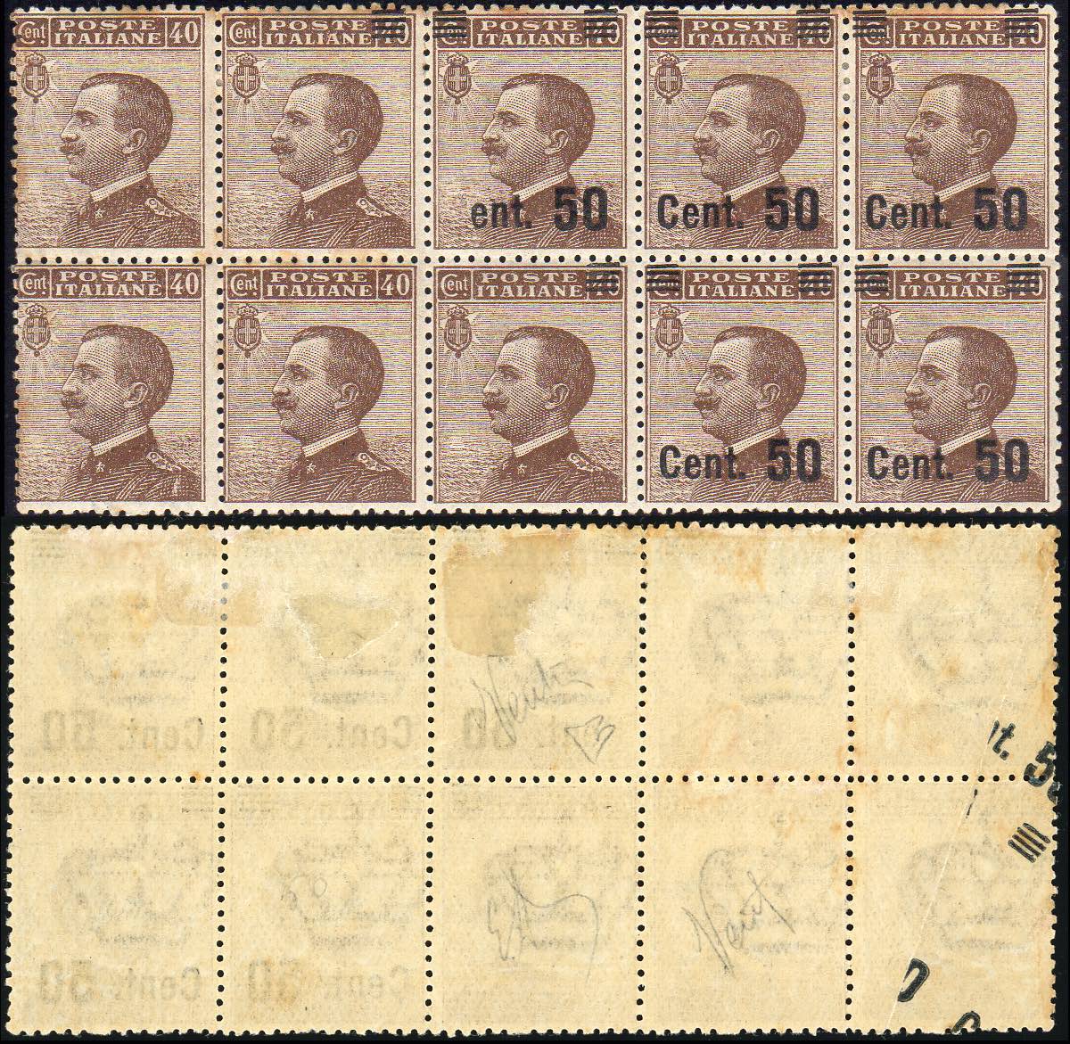 1923 - 50 su 40 cent. Michetti (139), blocco di dieci esemplari, due con soprastampa parziale solo al verso, uno totalmente privo, uno con ... Leggi tutto