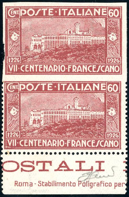1926 - 60 cent. San Francesco, coppia verticale con l'esemplare superiore non dentellato (195ka), leggermente sfiorato a sinistra, gomma originale integra. Bella e rara. Una delle quattro coppie note. Ferrario, cert. Diena di provenienza.