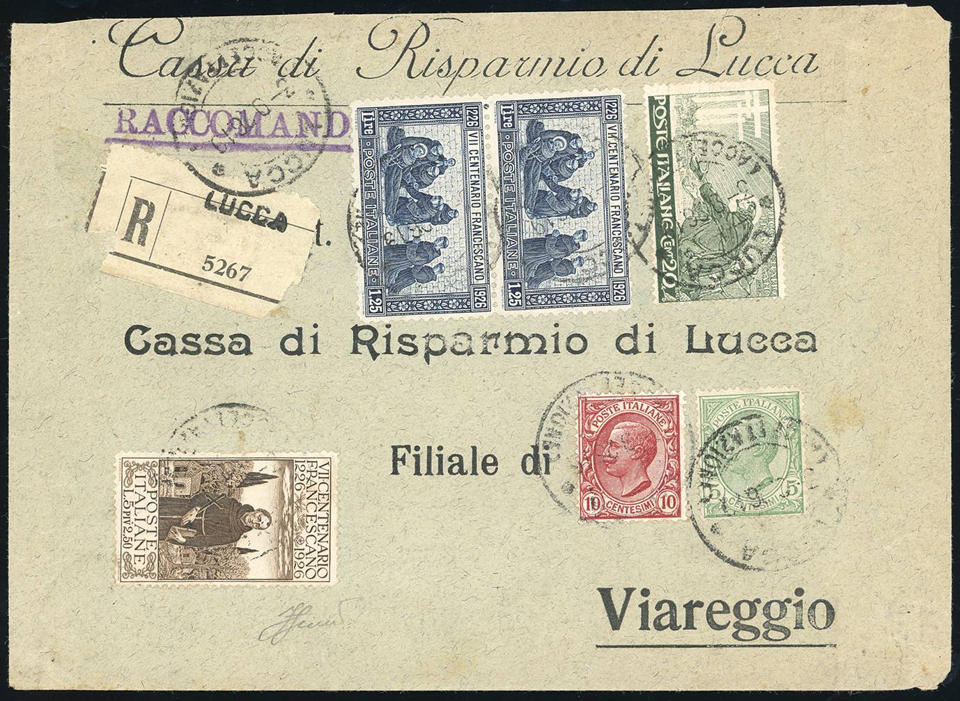 1926 - 5 2,50 lire, 20 cent., 1,25 lire, coppia, San Francesco, perfetti, con 5 e 10 cent. Leoni (197????), su raccomandata da Lucca 3/9/1926 a Viareggio. Ferrario.