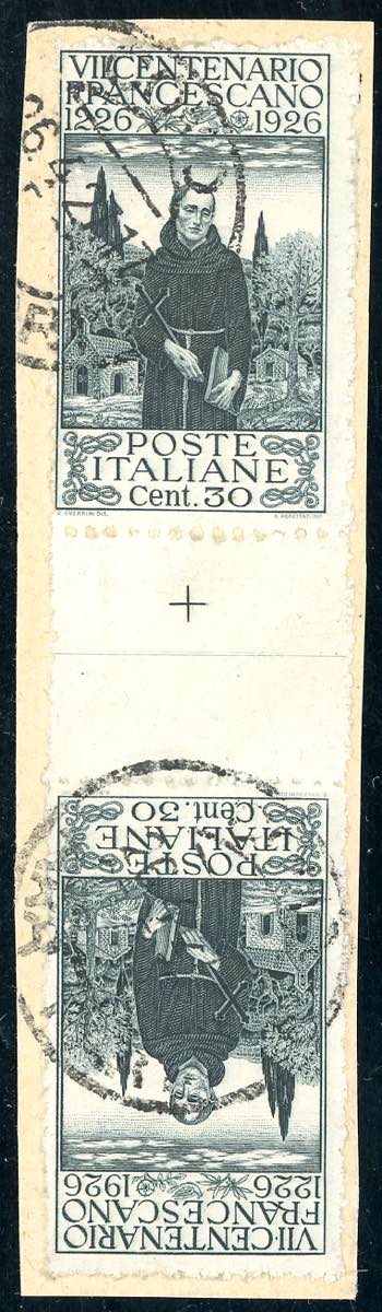 1926 - 30 cent. San Francesco, dent. 11, coppia verticale tete-beche con interspazio di gruppo al centro (198n), perfetta, usata su ... Leggi tutto