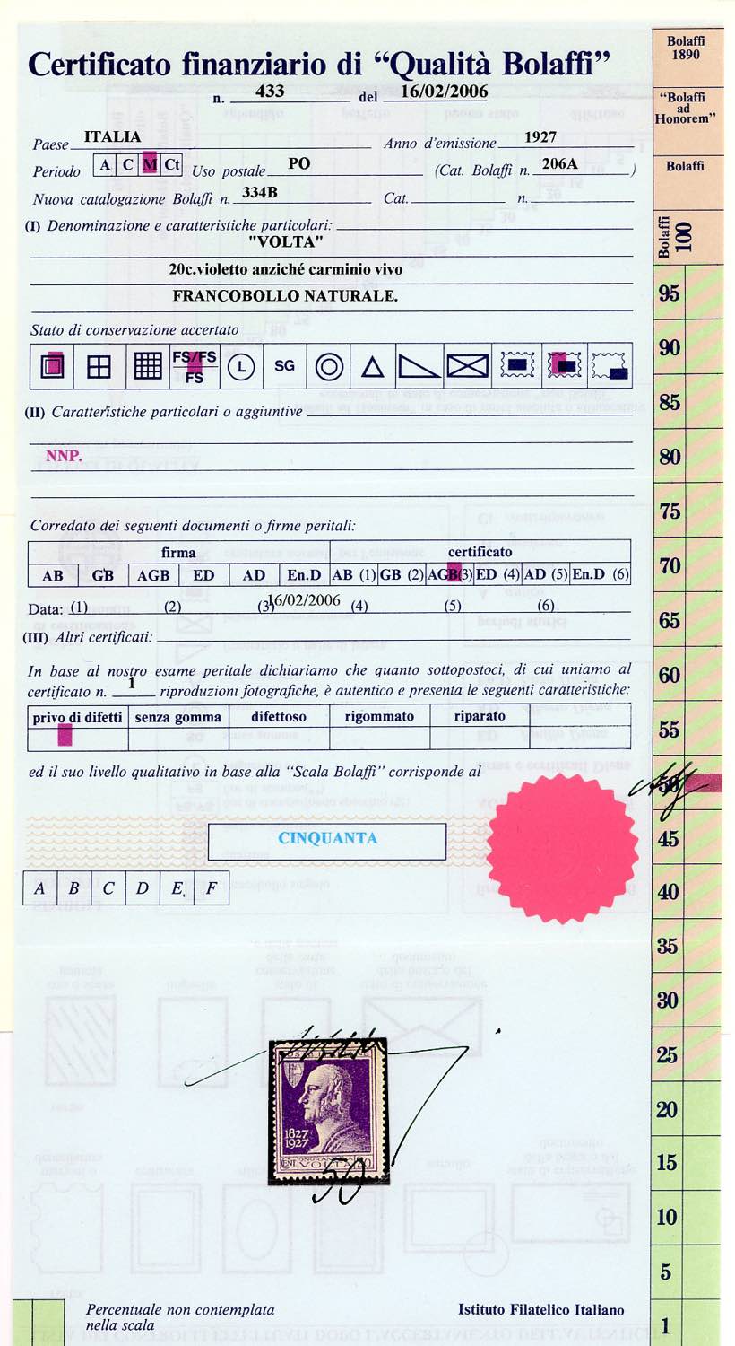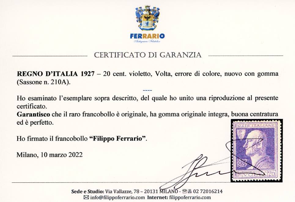 1927 - 20 cent. Volta violetto, errore di colore (210A), nuovo, gomma originale integra, perfetto. Molto fresco, buona centratura per questo raro francobollo che ebbe una tiratura di soli 480 esemplari. Raybaudi, cert. Bolaffi e Ferrario.