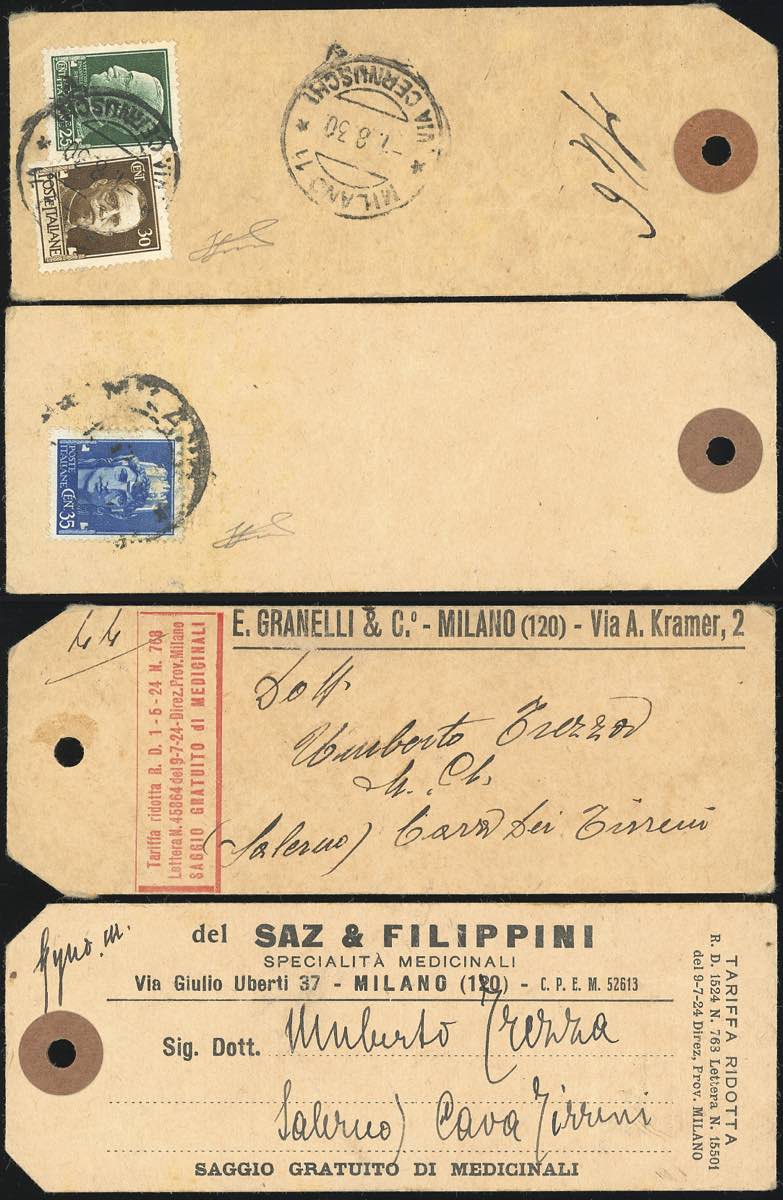1930 - Due talloncini di saggi gratuiti di medicinali, rispettivamente affrancate una con 35 cent. isolato, l'altro con 25 e 30 cent. Imperiale (250,248,249), entrambi indirizzati a Cava dei Tirreni. Non comuni! Ferrario.