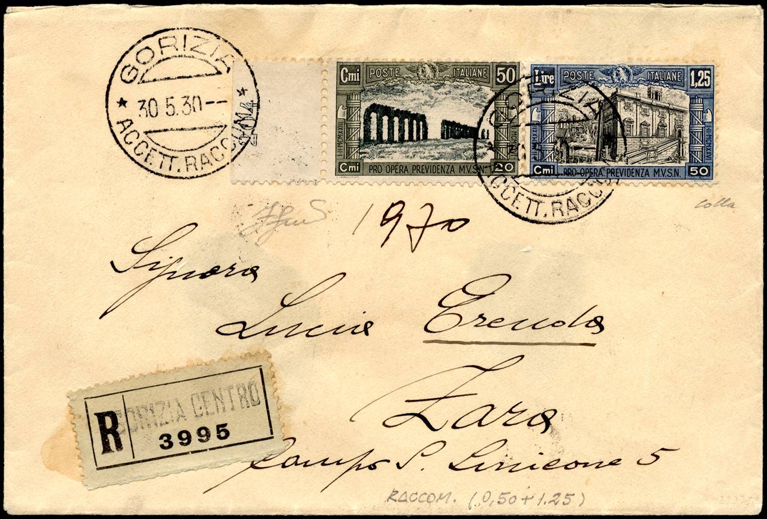1930 - 50 cent. 20 cent. e 1,25 cent. Milizia III (273?), perfetti, il bordo di foglio con numero di tavola 204, su busta raccomandata da Gorizia 30/5/1930 a Zara. Bella e raro uso postale. G.Colla, Ferrario.