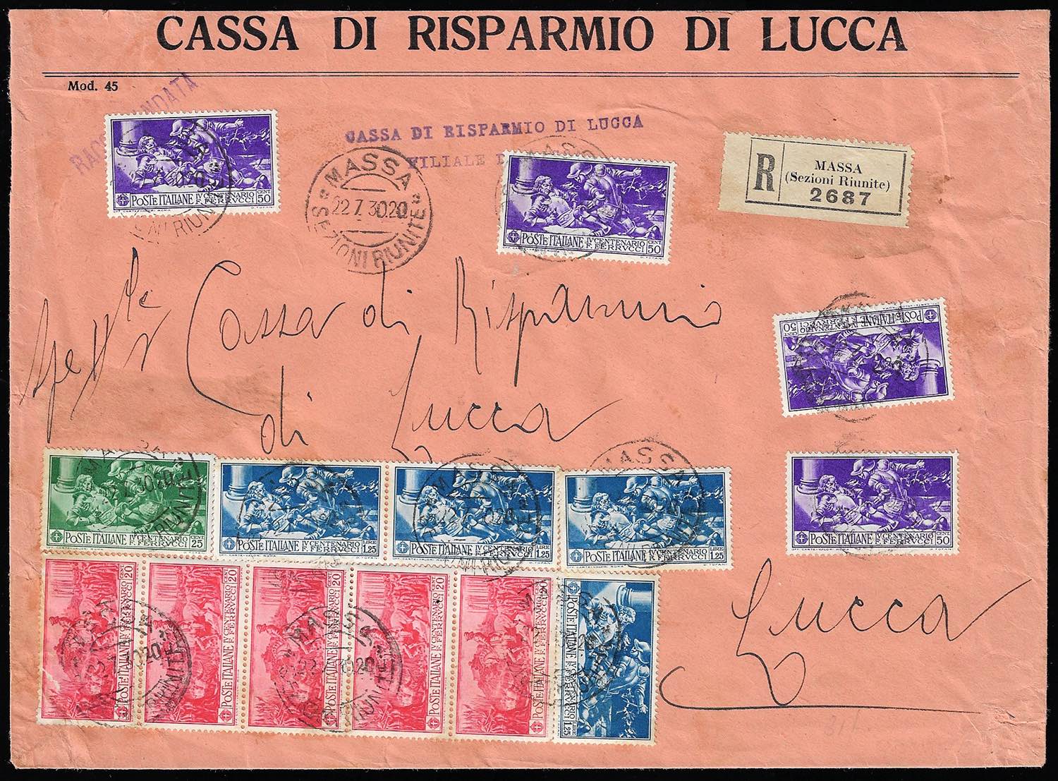 1930 - 20 cent., striscia di cinque, 25 cent., 50 cent., quattro esemplari, 1,25 lire, quattro esemplari (276/279), lievi difetti su qualche esemplare, su busta raccomandata da Massa 22/7/1930 a Lucca.