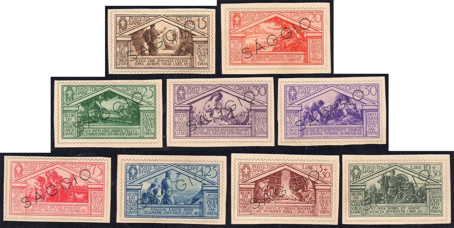 1930 - Virgilio (282/290), serie completa, stampati su cartoncino, non dentellati, con dicitura SAGGIO, provenienti da opuscolo informativo distribuito negli uffici postali. Curiosità.