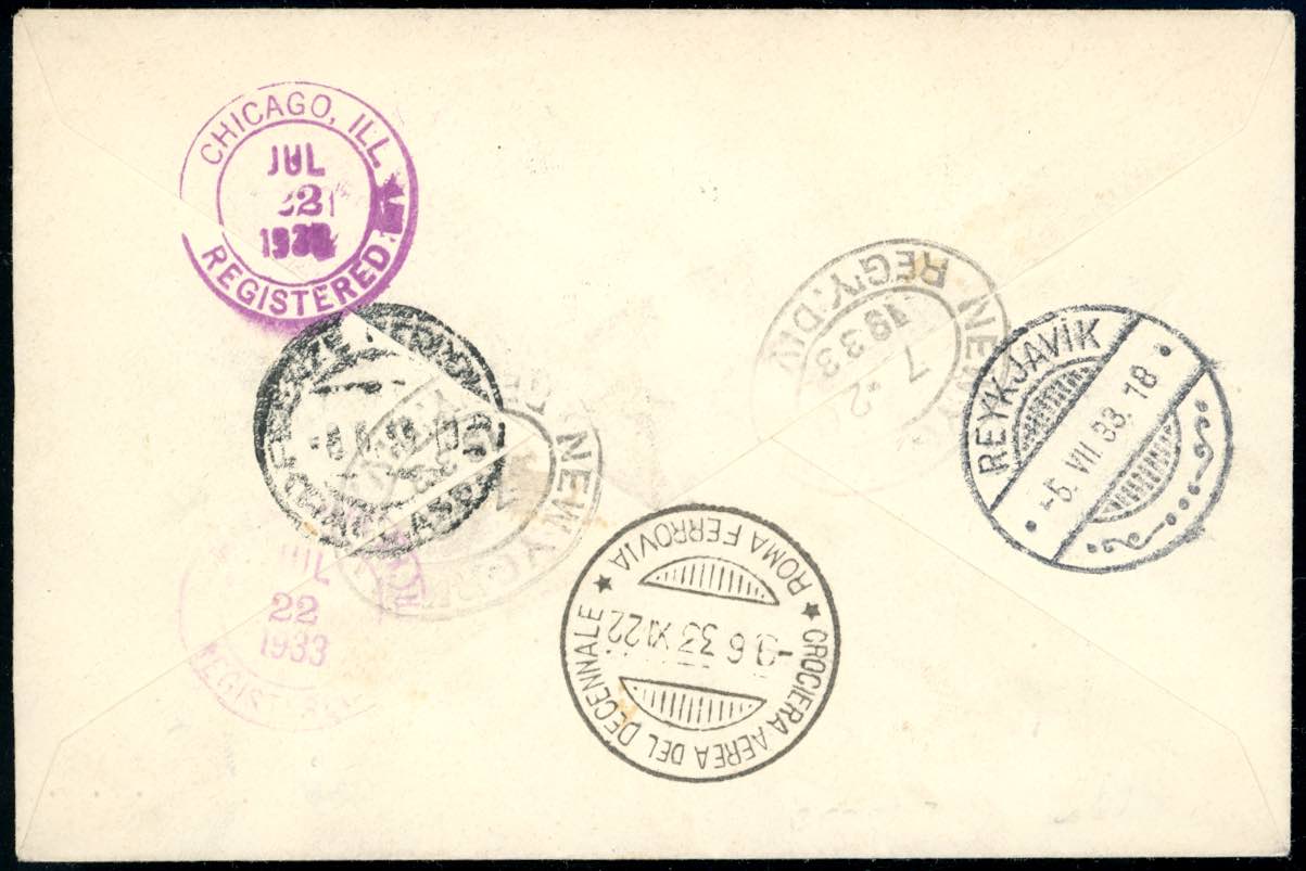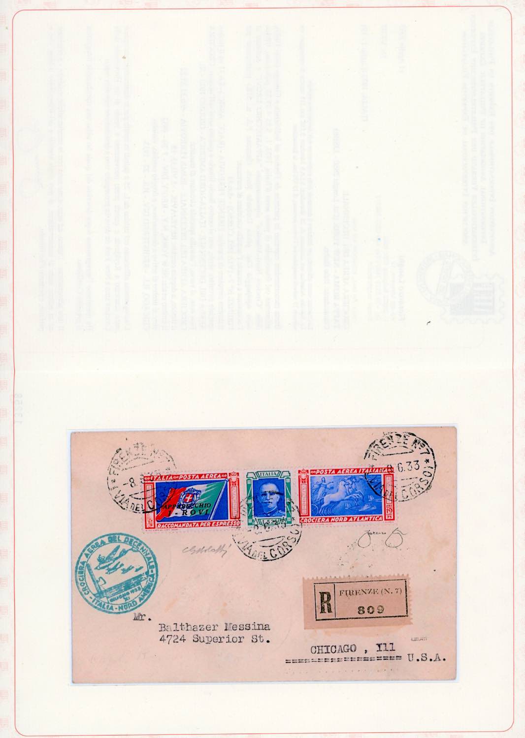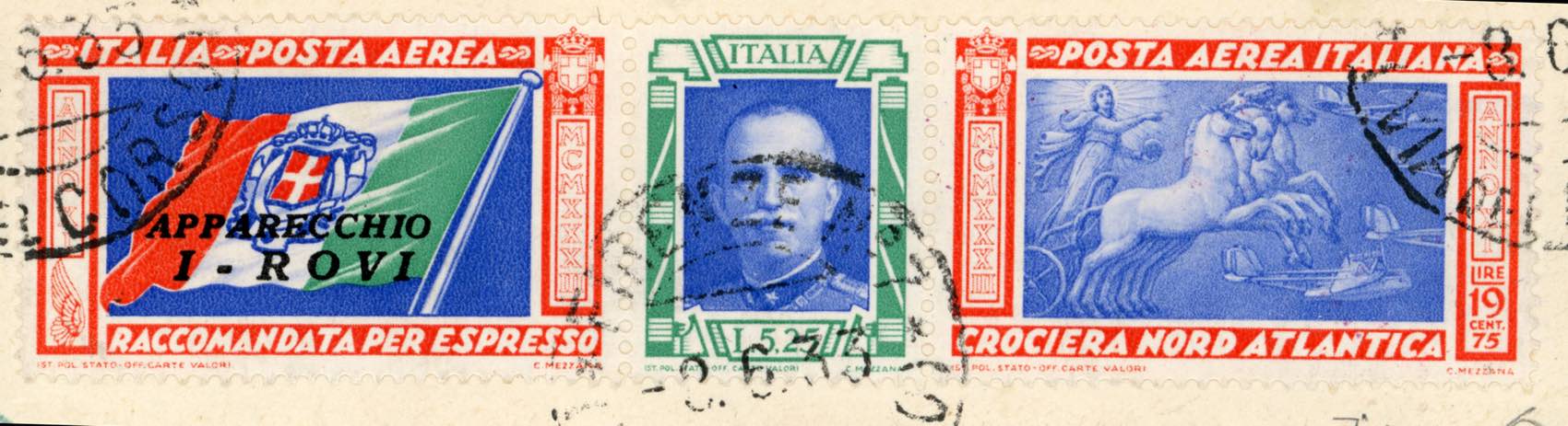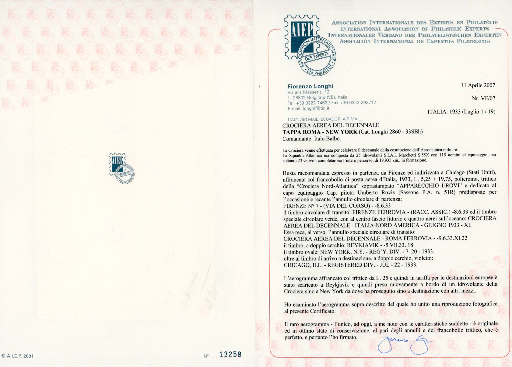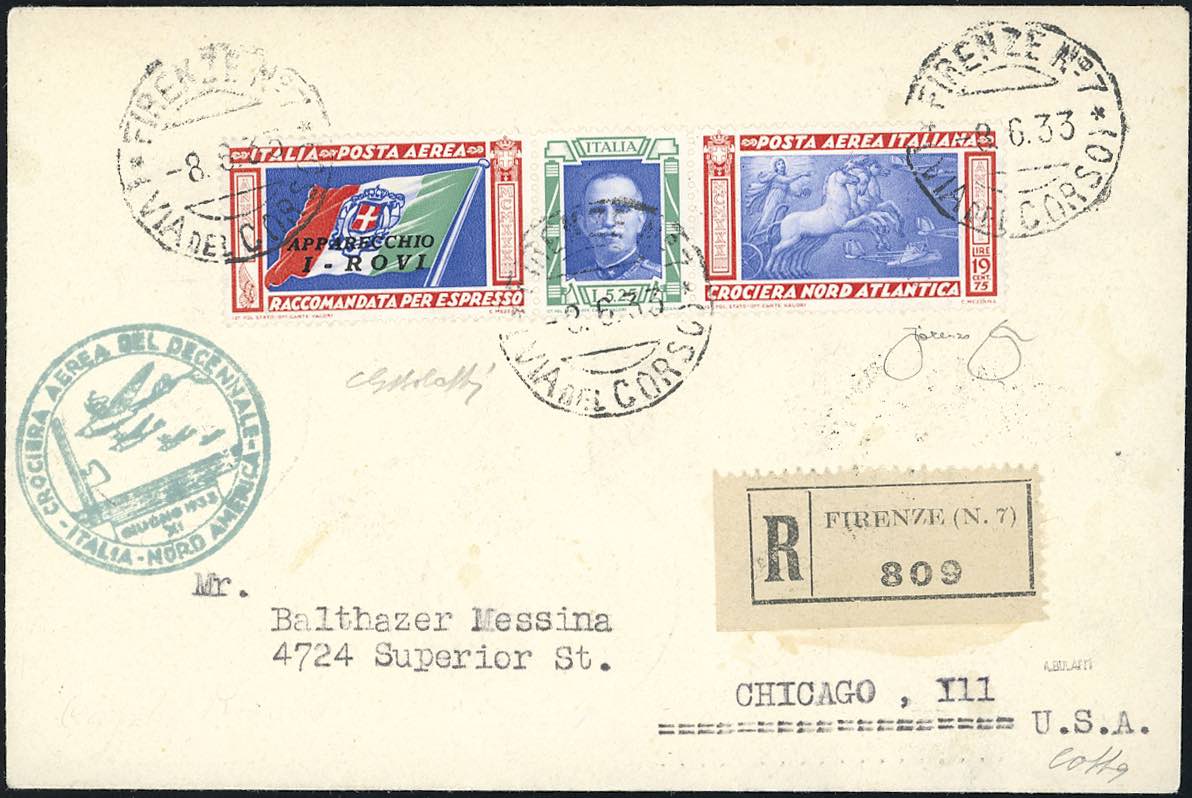 1933 - 5,25 19,75 lire Trittico I-ROVI (51R), perfetto, su aerogramma raccomandato da Firenze 8/6/1933 a Chicago, U.S.A., bollo d'arrivo del 22/7/1933. L'aerogramma, trasportato con la Crociera Aerea fu scaricato a Reykjavik, come da corretta affrancatura. Successivamente fu inoltrato negli Stati Uniti con altri mezzi. Ottima qualità. Colla, G.Bolaffi, cert. Longhi del 2007 che lo indica come "UNICO NOTO CON LE SUDDETTE CARATTERISTICHE".