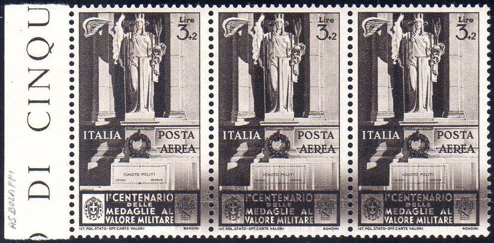 1934 - 3 2 lire Medaglie al valore (80), macchie di stampa in basso, striscia di tre, bordo di foglio, gomma integra, perfetta. Bella varietà non catalogata.