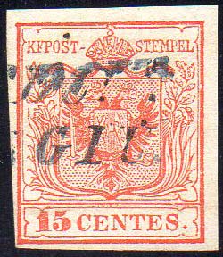 PADOVA, SI azzurro 11 punti - 15 cent. (3a), perfetto, usato nel giugno 1850. G.Oliva, Ferrario.