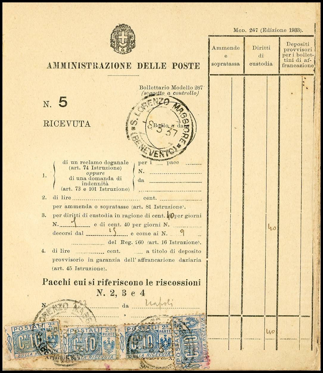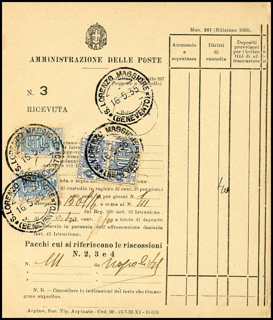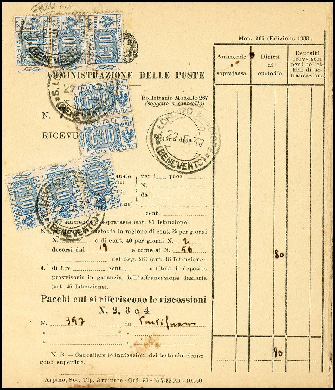 1934/76 - Bollettario completo di 50 matrici del mod. 267, utilizzate nell'arco di 43 anni nell'ufficio postale di S.Lorenzo Maggiore, per lo più affrancate con francobolli per pacchi di Regno e Repubblica. Insieme molto raro!