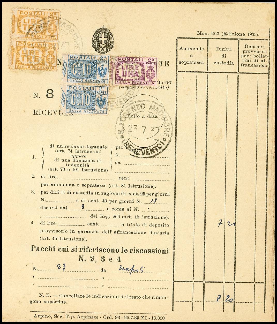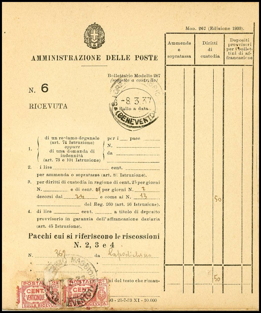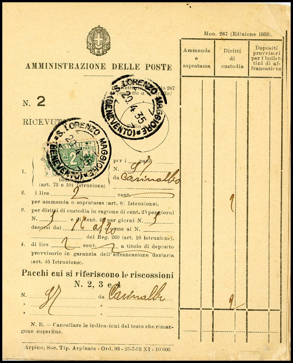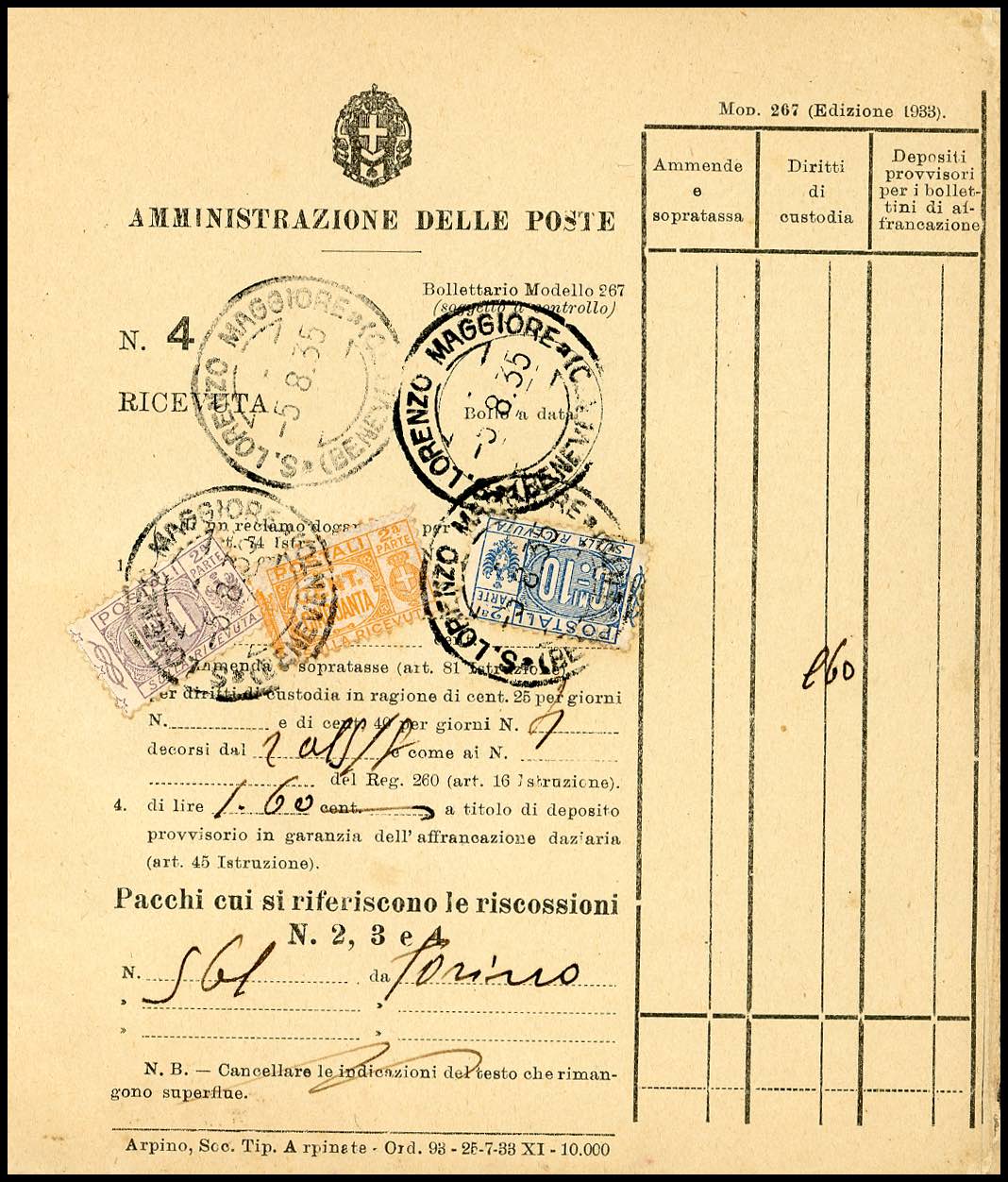 1934/76 - Bollettario completo di 50 matrici del mod. 267, utilizzate nell'arco di 43 anni nell'ufficio postale di S.Lorenzo Maggiore, per lo più affrancate con francobolli per pacchi di Regno e Repubblica. Insieme molto raro!