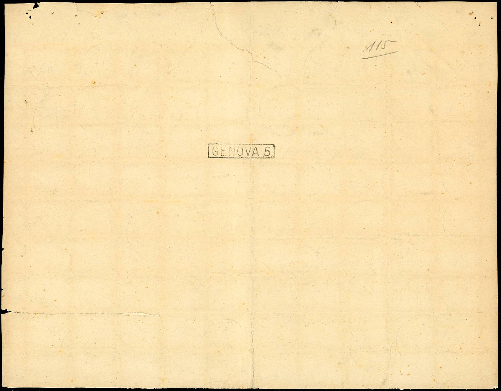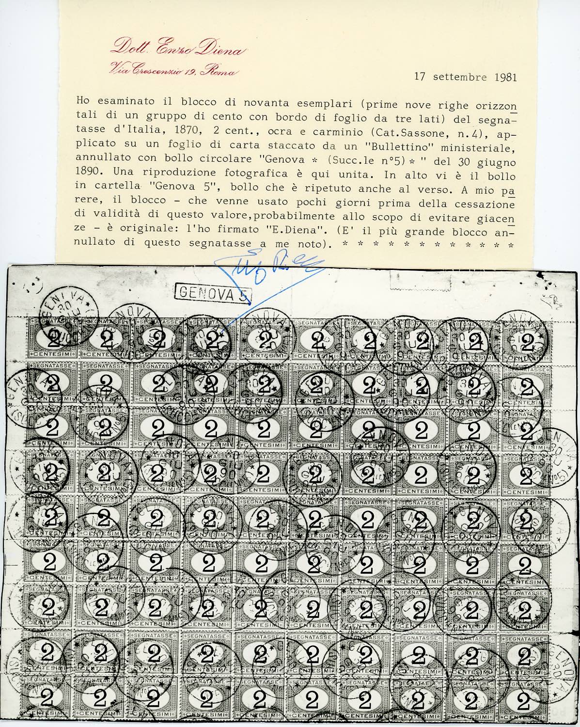 1870 - 2 cent. ocra e carminio (4), blocco di 90 esemplari, angolo di foglio, lievi difetti, usato su frammento a Genova 30/6/1890, pochi giorni prima della cessazione della validità postale, probabilmente per evitare le giacenze. Massimo multiplo usato di questo francobollo, insieme unico! Rarità del settore. Cert. E.Diena.