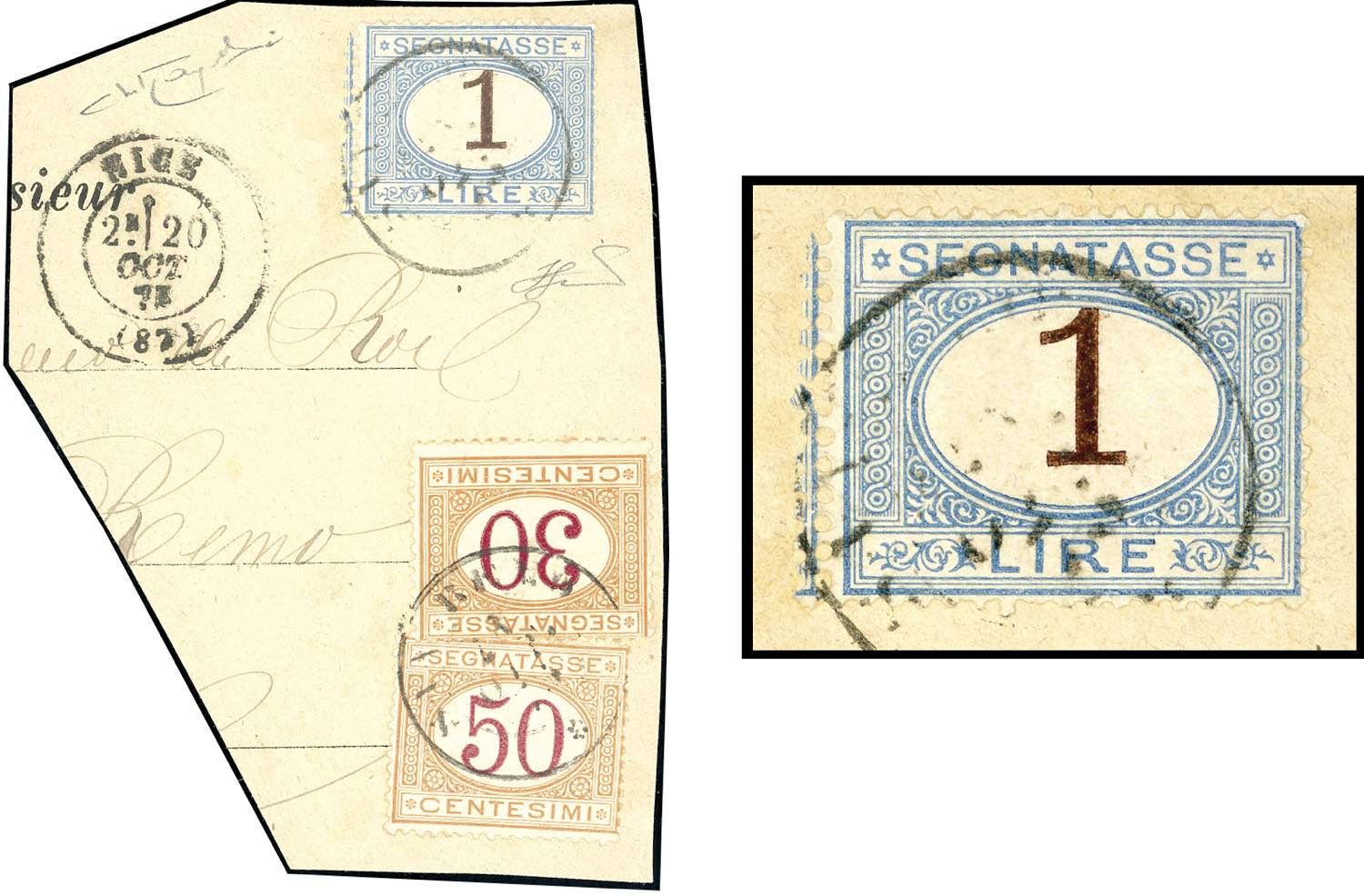 1870 - 1 lira azzurro chiaro e bruno, doppia dentellatura a sinistra, 30 e 50 cent. ocra e carminio (11fa,7,9), perfetti, usati su piccolo frammento a San Remo. Si tratta dell'UNICO ESEMPLARE NOTO con questa varietà. Ferrario, cert. Oro Raybaudi.