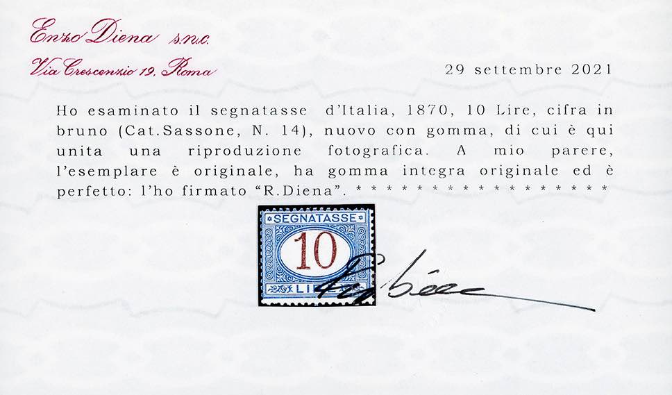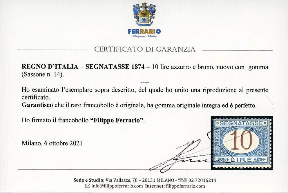 1874 - 10 lire azzurro e bruno (14), nuovo, gomma originale integra, perfetto. Molto fresco e buona centratura per l'emissione. Raro. Cert. Ferrario e Diena.