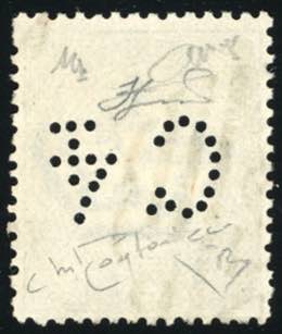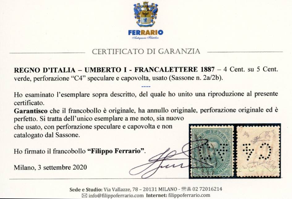 1887 - 4 cent. su 5 cent. verde, perforazione "C4" speculare e capovolta (2a/2b), usato, perfetto. Si tratta dell'UNICO ESEMPLARE NOTO sia nuovo che usato e non catalogato. Rarità del settore! Raybaudi, Enzo Diena, cert. Ferrario.
