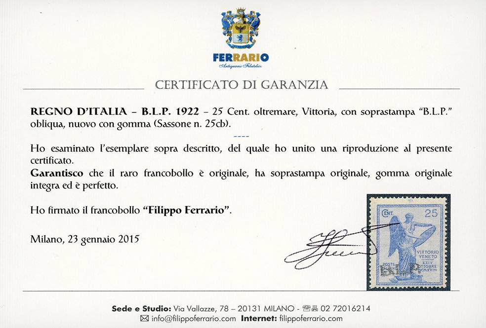 1922 - 25 cent. Vittoria, soprastampa BLP obliqua (25cb), gomma originale integra, perfetto. Fresco e rarissimo. Sorani. Cert. Ferrario.