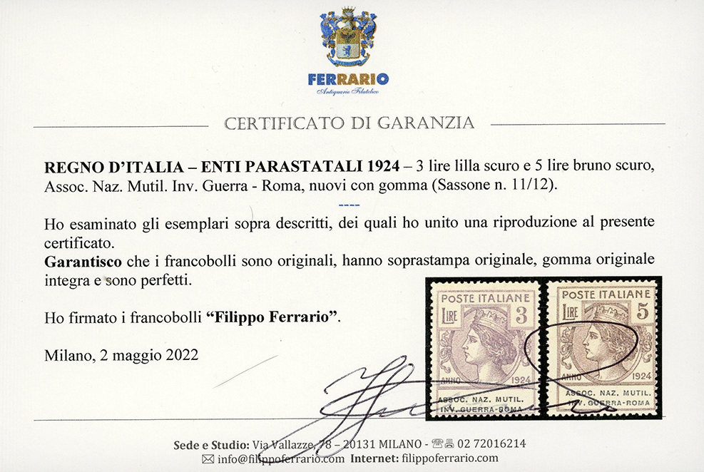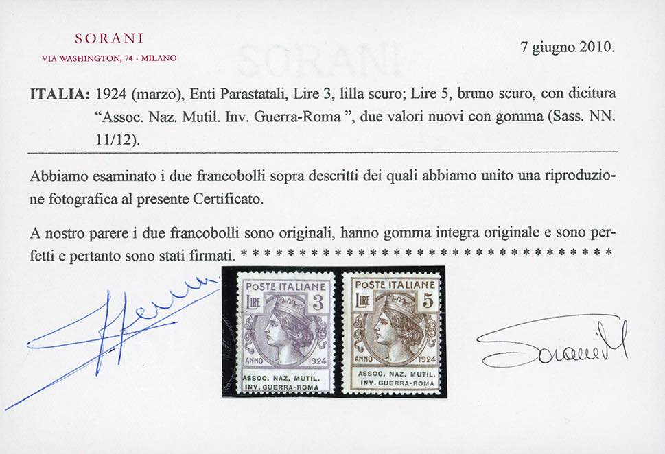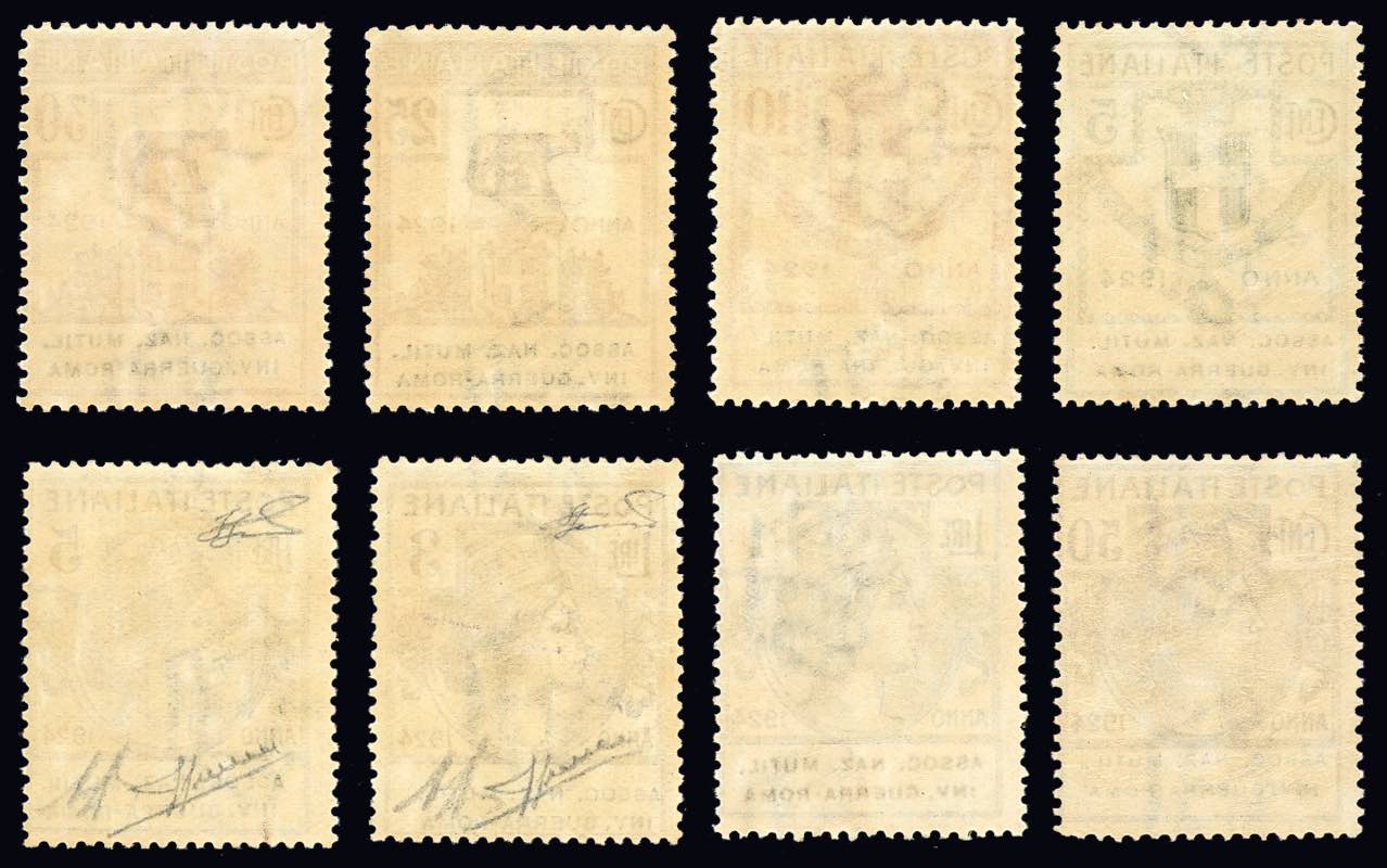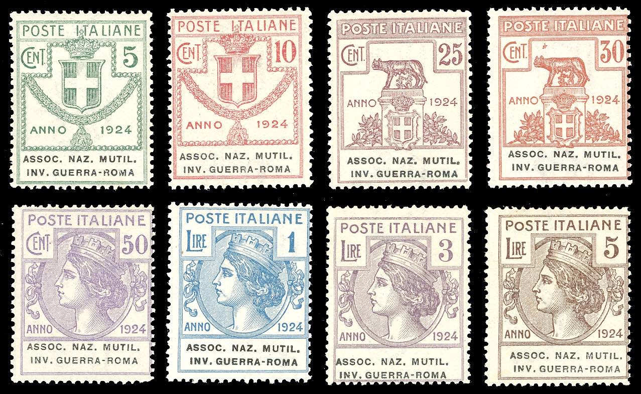 ASSOC. NAZ. MUTIL. INV. GUERRA - ROMA 1924 - Serie completa (5/12), gomma originale integra, perfetti. I due alti valori cert. Sorani e Ferrario.