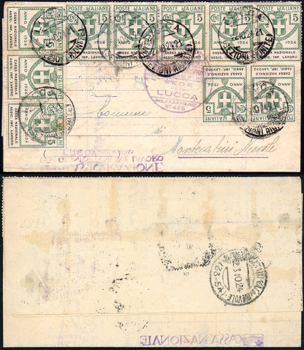 CASSA NAZIONALE ASSIC. INF. LAVORO 1924 - 5 cent. (17), dieci esemplari su lettera da Lucca 22/10/1924 a Montecatini. Molto rara, si tratta ... Leggi tutto