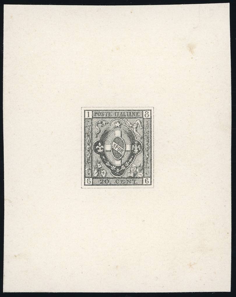 1866 - Saggio Coucorde, con al centro uno stemma con la dicitura "SPQR" contornato dai simboli degli Stati preunitari, stampa in nero su cartoncino spesso, senza gomma come sempre, perfetto. Molto raro.