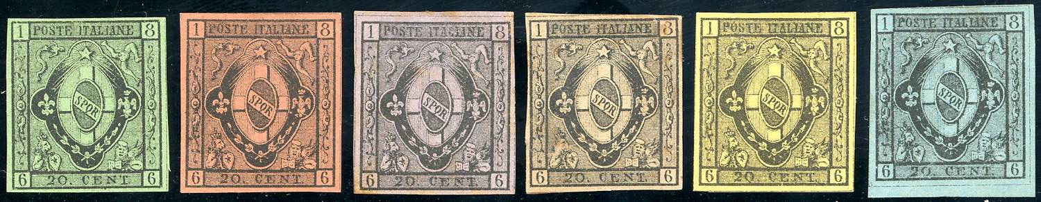 1866 - Saggio Coucorde, con al centro uno stemma con la dicitura "SPQR", contornato dai simboli degli Stati preunitari, su carta sottile colorata, sei esemplari di colori differenti, senza gomma come sempre, tre esemplari perfetti, tre con lievi assottigliamenti.