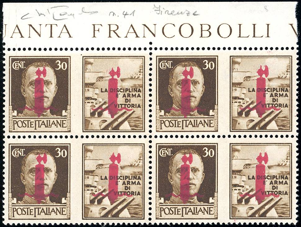 1944 - 30 cent. Marina, soprastampa fascio su entrambe le sezioni in carminio lillaceo, tiratura di Firenze (41), blocco di quattro, bordo ... Leggi tutto