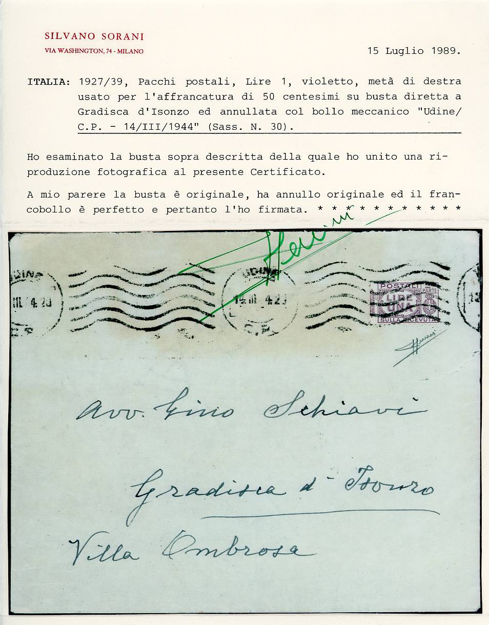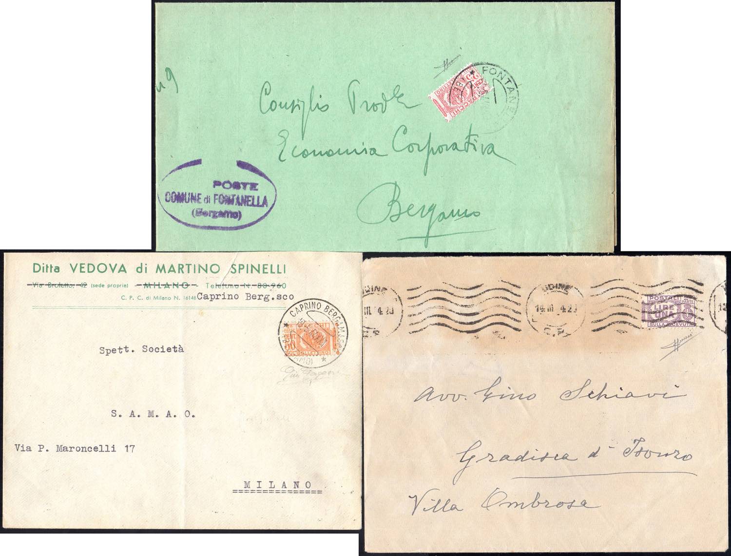 1944 - 25 cent., 50 cent., 1 lira pacchi postali con fasci al centro (26,28,30), tutti usati in frode con una sola sezione, su tre buste rispettivamente da Fontanella, Caprino Bergamasco e Udine. Interessanti e rare. Tutte firmate, 1 lira cert. Sorani.