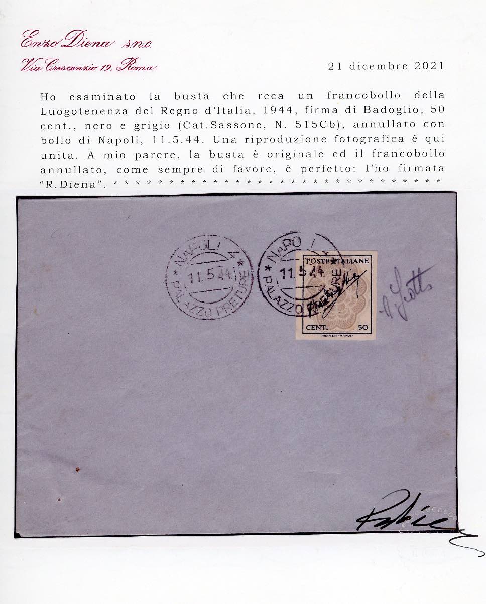 1944 - 50 cent. nero su grigio Badoglio, non dentellato (515Cb), perfetto, usato su busta non viaggiata "Napoli 11/5/1944". Raro. Cert. Diena.