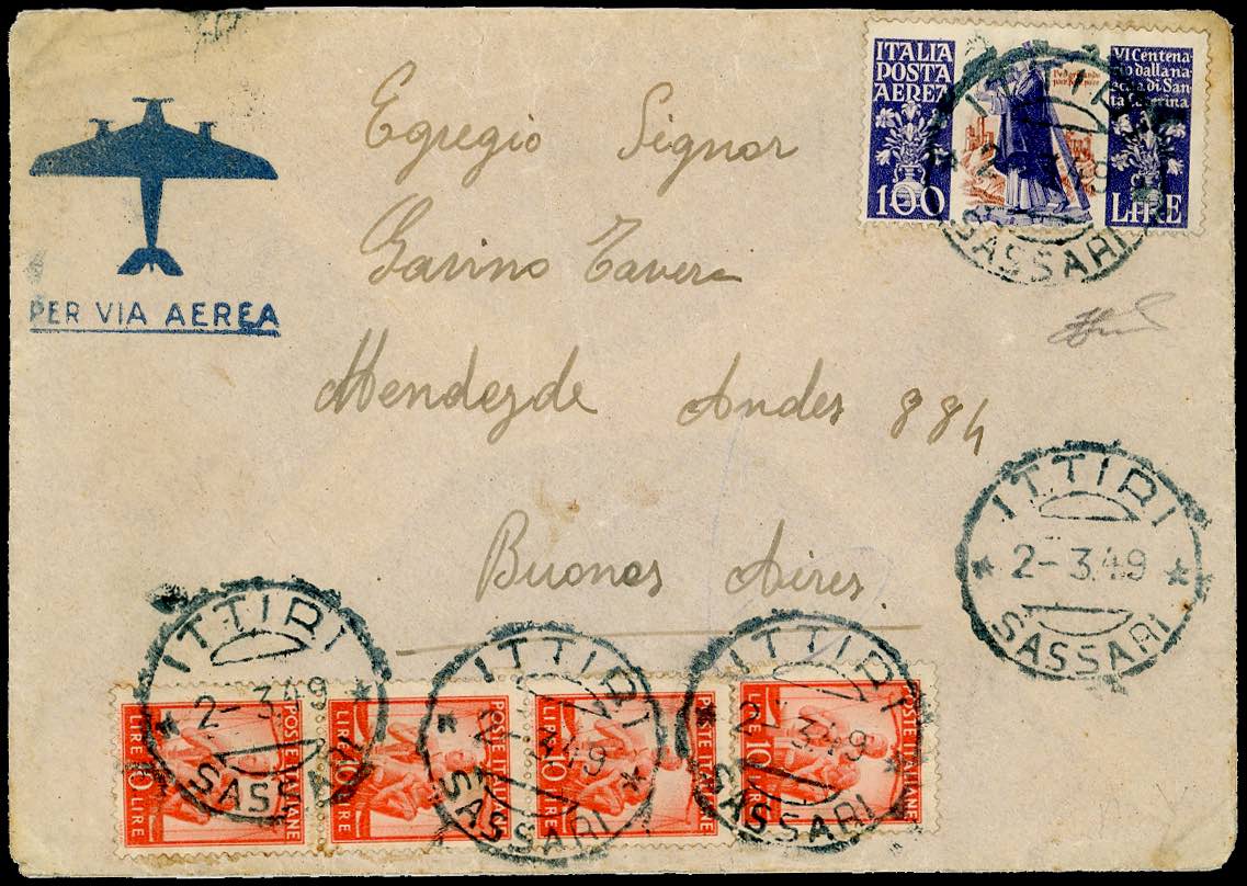 1949 - 100 lire S.Caterina, 10 lire Democratica, striscia di tre e singolo (A146,559), perfetti, su aerogramma da Ittiri 2/3/1949 a Buenos ... Leggi tutto