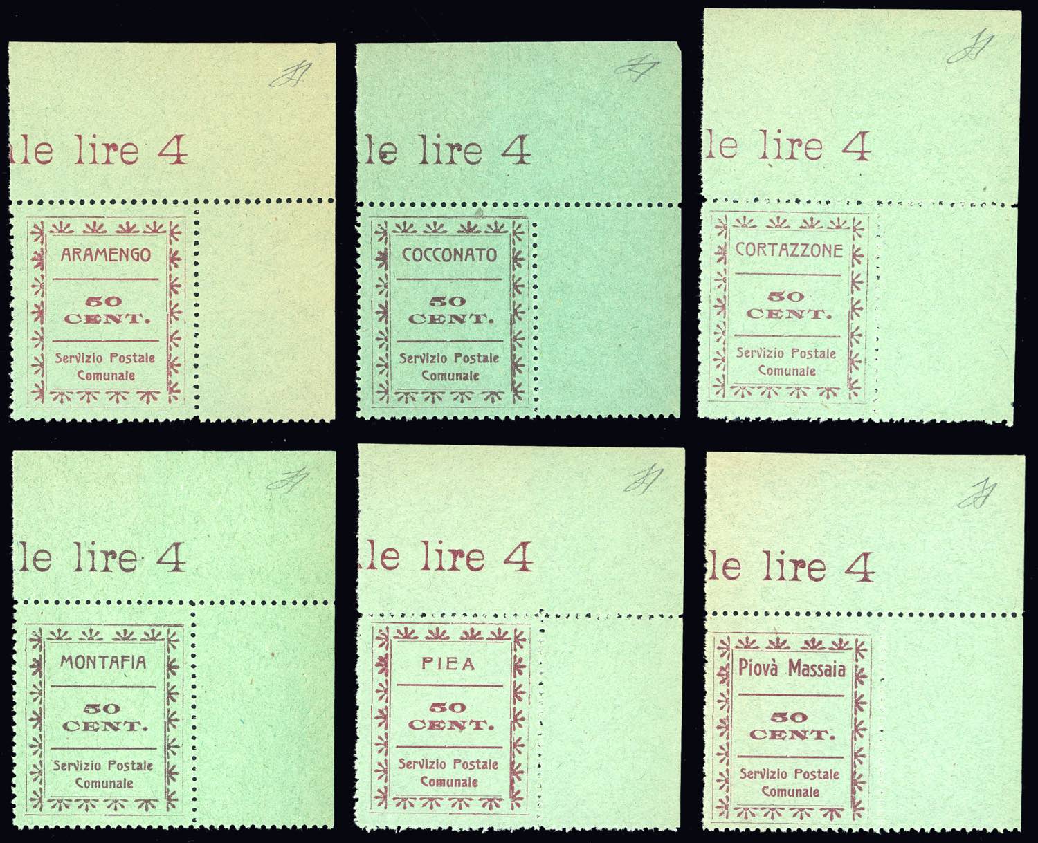 ASTIGIANO 1944 - Serie completa di sei valori, dei vari Comuni (CEI, Unificato 1/6), angolo di foglio, senza gomma come sempre, perfetti. Ferrario.