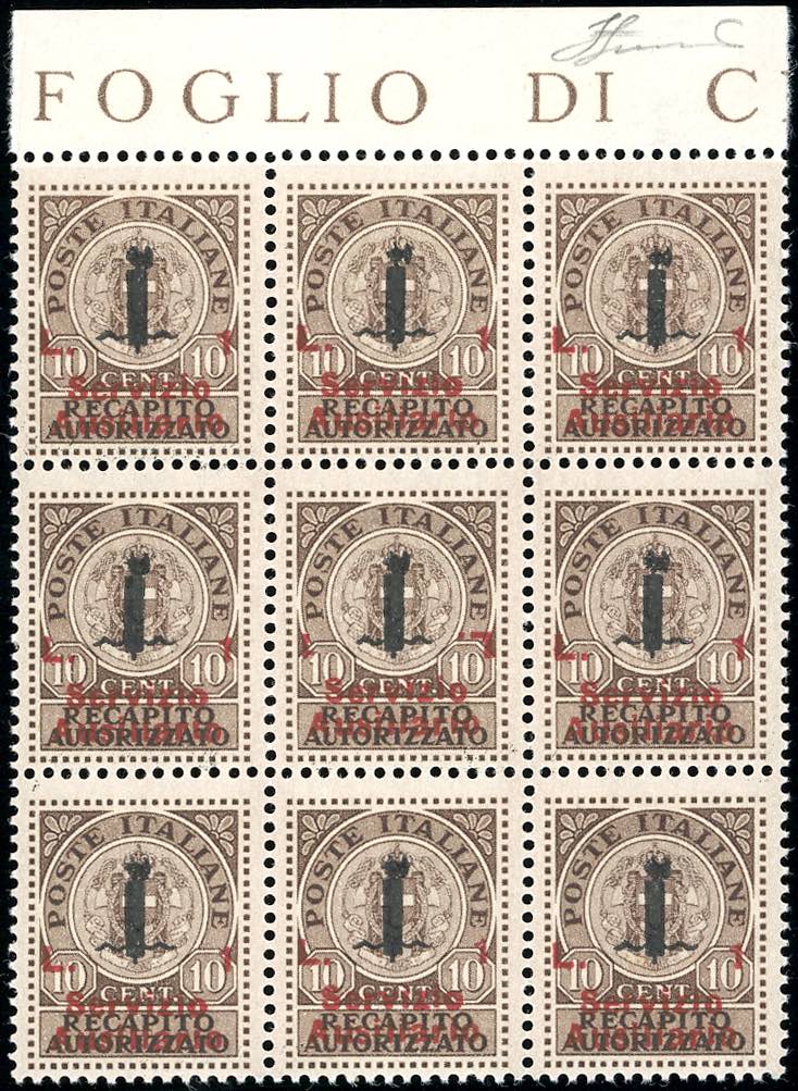 GUIDIZZOLO 1945 - 1 lira su 10 cent. bruno, recapito autorizzato, soprastampa margine di foglio superiore, con l'esemplare centrale ... Leggi tutto