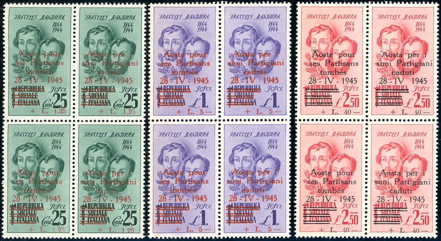 AOSTA 1945 - Fratelli Bandiera soprastampati in francese e italiano (CEI 1/6), blocchi di quattro, gomma integra, perfetti. Cert. Raybaudi.