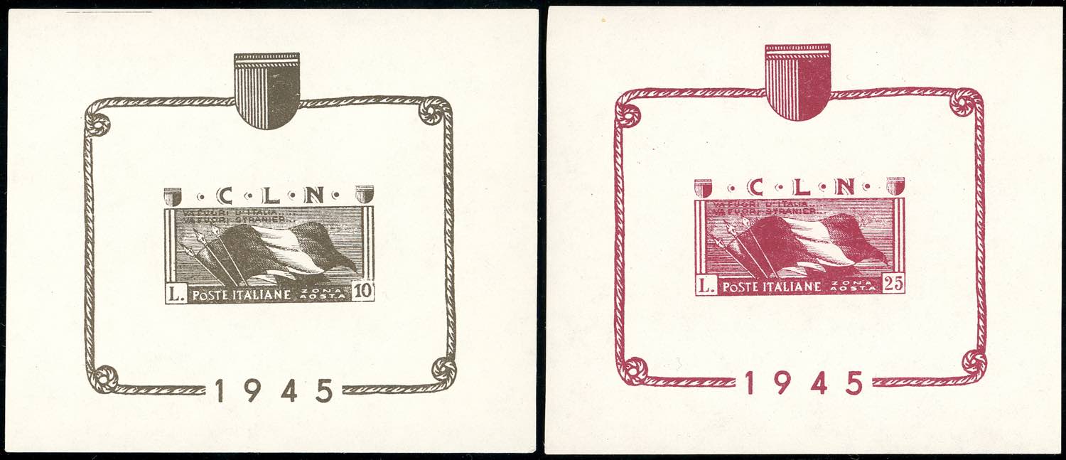 AOSTA FOGLIETTI 1944 - 10 lire e 25 lire, foglietti (1/2), gomma integra, perfetti. Belli.