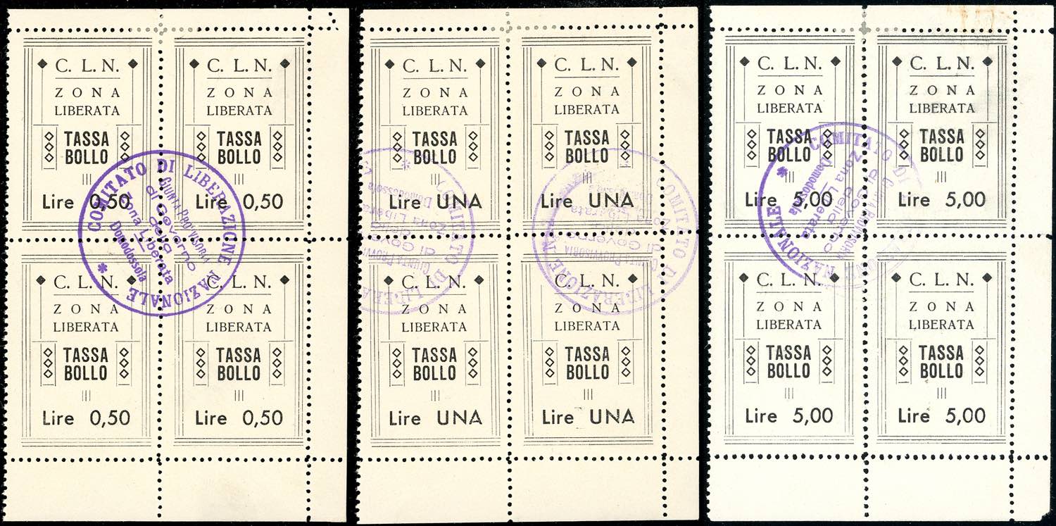 DOMODOSSOLA FISCALI 1944 - Marche fiscali (Errani 1/3), blocchi di quattro preannullati con il bollo della Giunta provvisoria di Governo e ... Leggi tutto