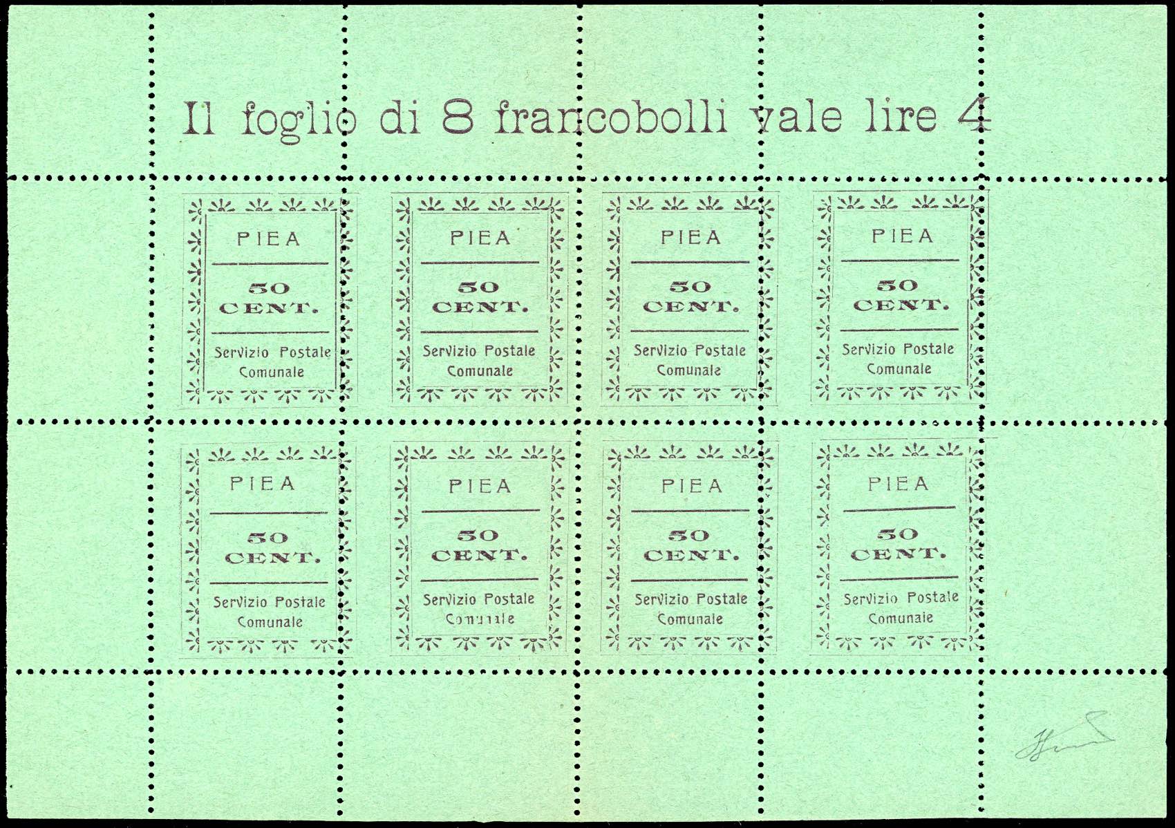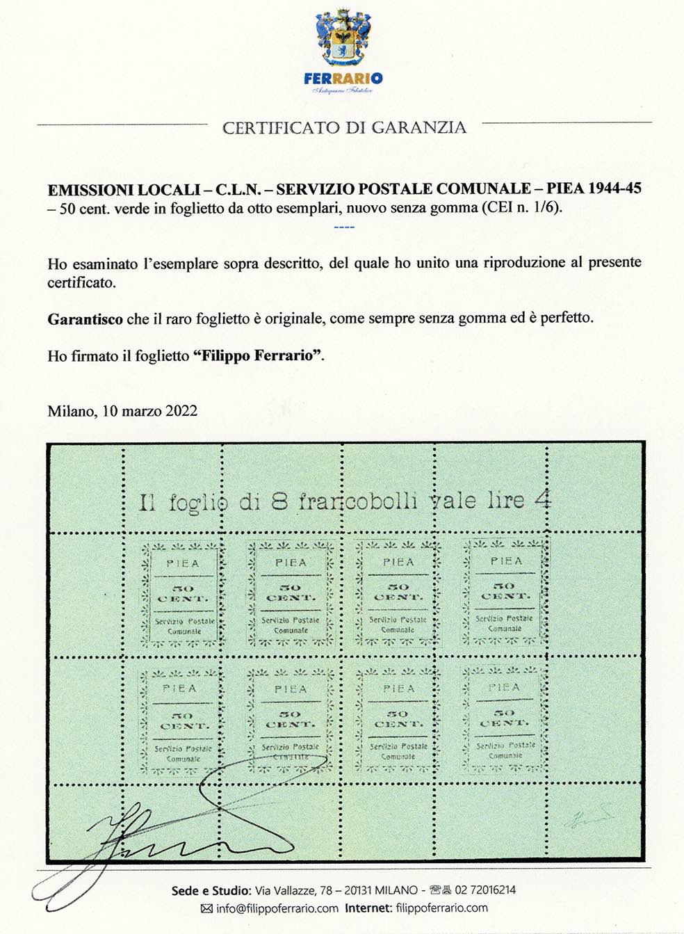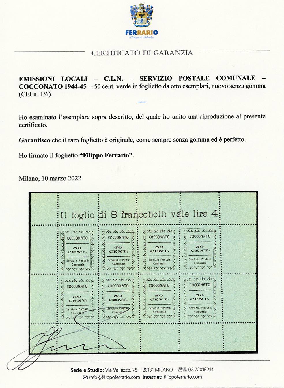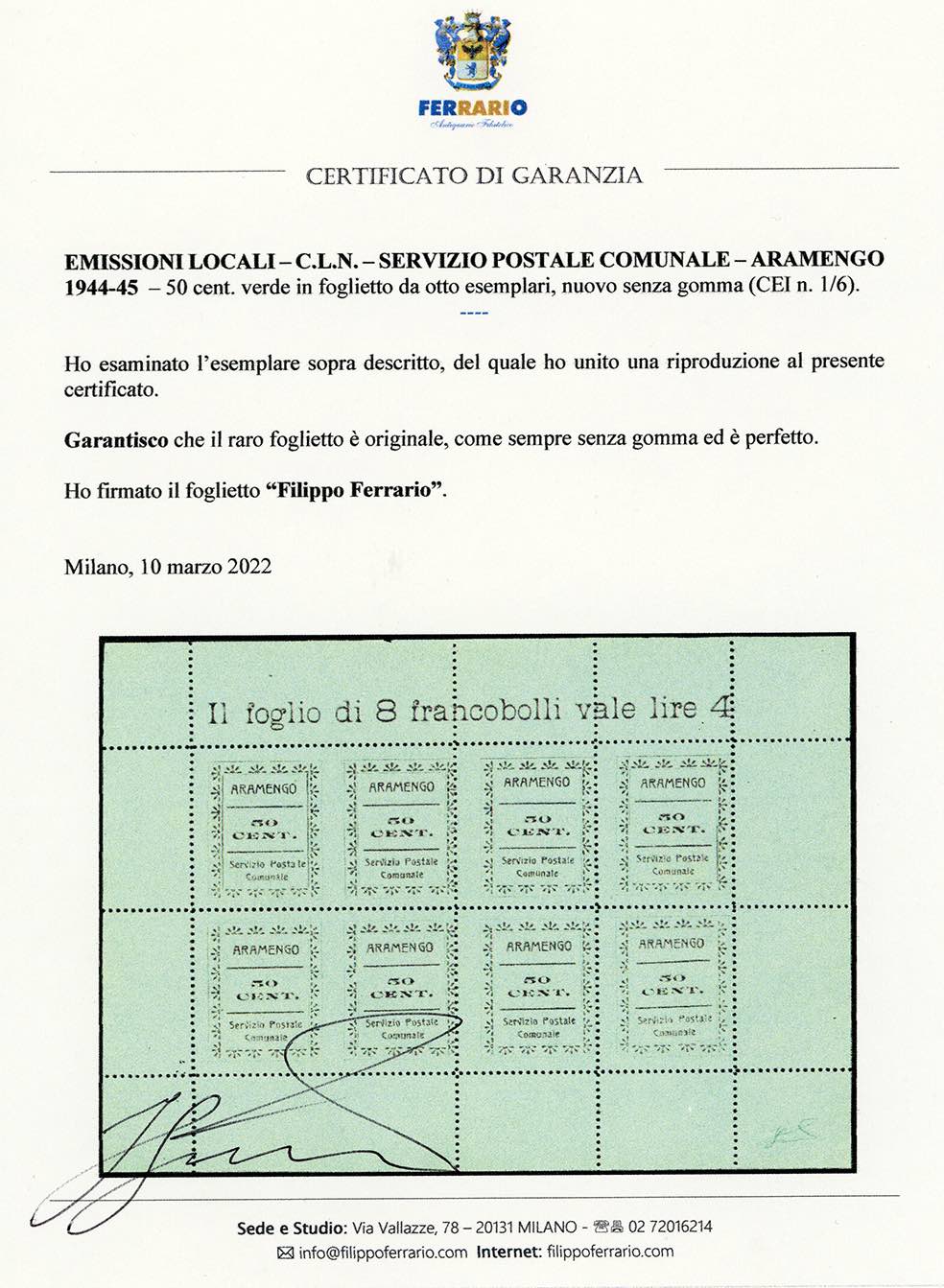 SERVIZIO POSTALE COMUNALE ARAMENGO,COCCONATO,CORTAZZONE,MONTAFIA,PIEA,PIOVA' MASSAIA 1944/45 - Serie completa di sei valori da 50 cent. in foglietti da otto esemplari (CEI n.1/6), nuovi, senza gomma come sempre, perfetti. Molto belli e rari. Cert. Ferrario
