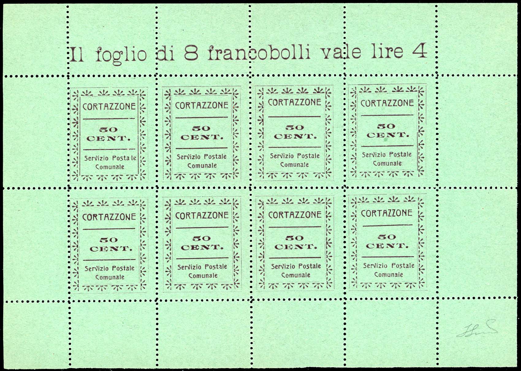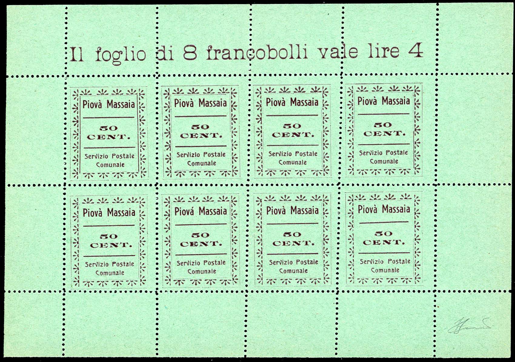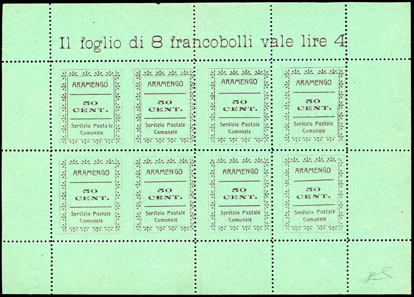 SERVIZIO POSTALE COMUNALE ARAMENGO,COCCONATO,CORTAZZONE,MONTAFIA,PIEA,PIOVA' MASSAIA 1944/45 - Serie completa di sei valori da 50 cent. in foglietti da otto esemplari (CEI n.1/6), nuovi, senza gomma come sempre, perfetti. Molto belli e rari. Cert. Ferrario