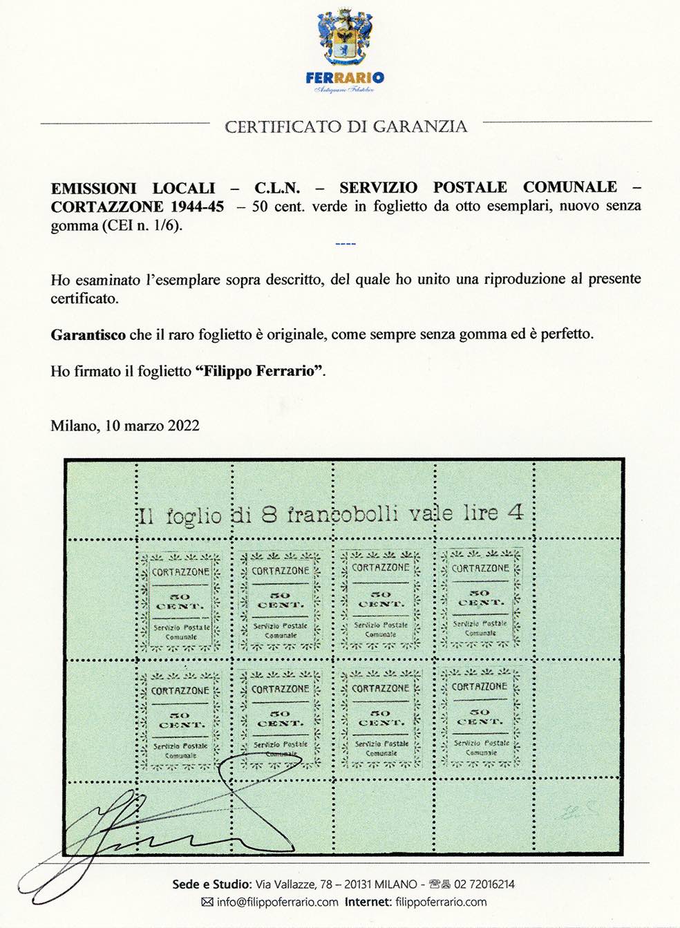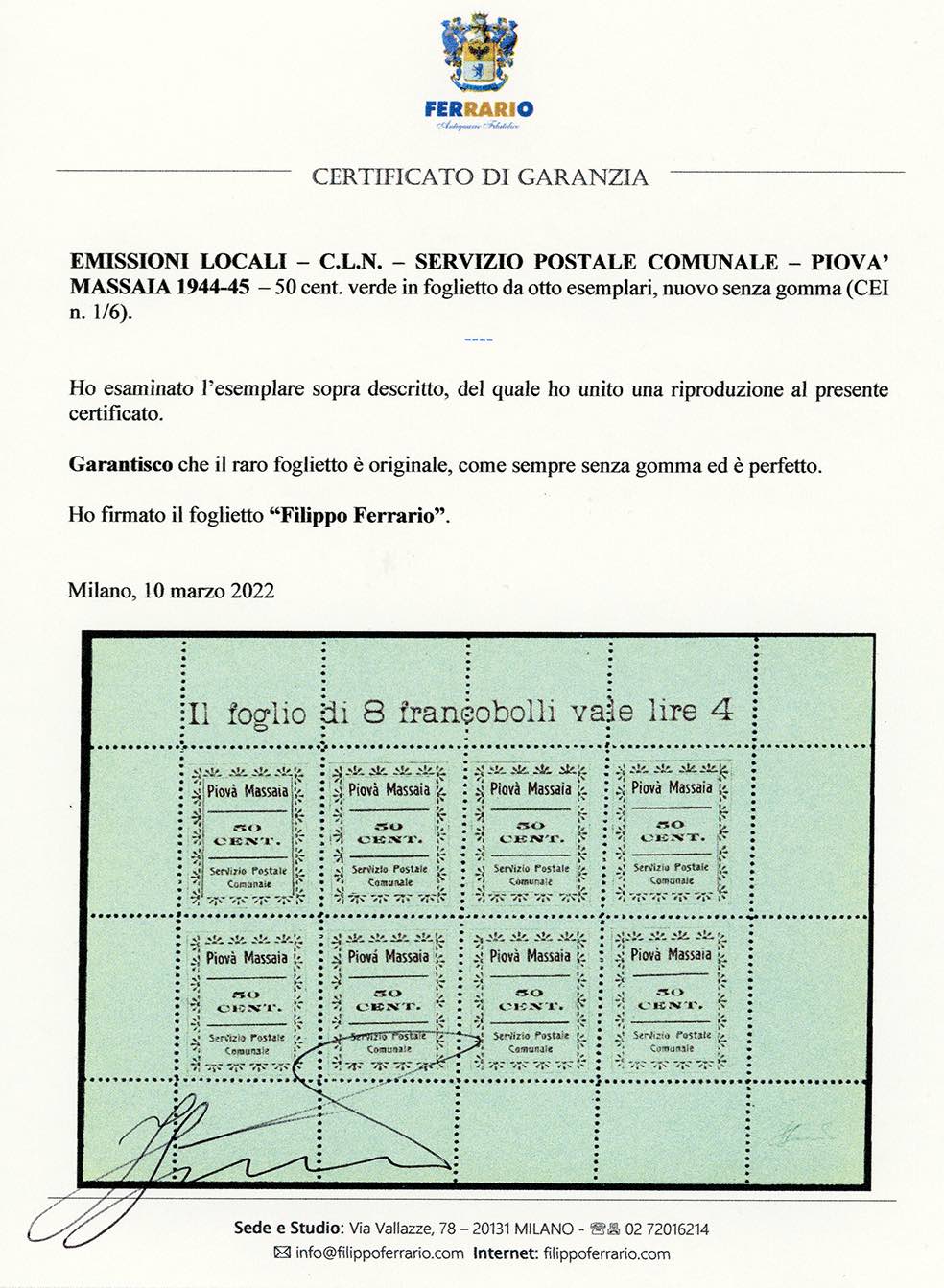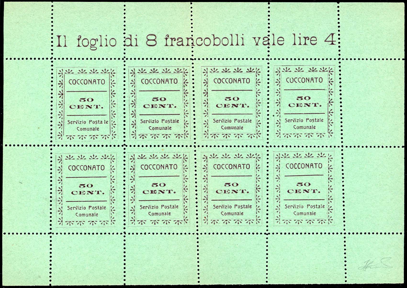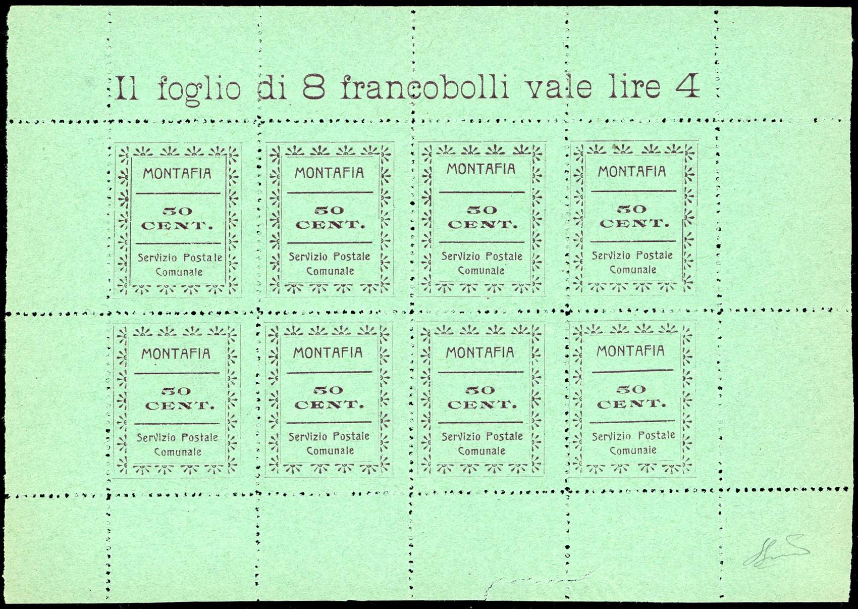SERVIZIO POSTALE COMUNALE ARAMENGO,COCCONATO,CORTAZZONE,MONTAFIA,PIEA,PIOVA' MASSAIA 1944/45 - Serie completa di sei valori da 50 cent. in foglietti da otto esemplari (CEI n.1/6), nuovi, senza gomma come sempre, perfetti. Molto belli e rari. Cert. Ferrario