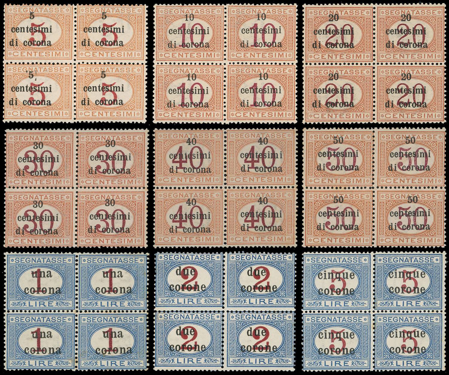 TRENTO E TRIESTE SEGNATASSE 1919 - Soprastampati (1/9), blocchi di quattro, gomma integra, perfetti, minimi punti di ossidazione su alcuni ... Leggi tutto