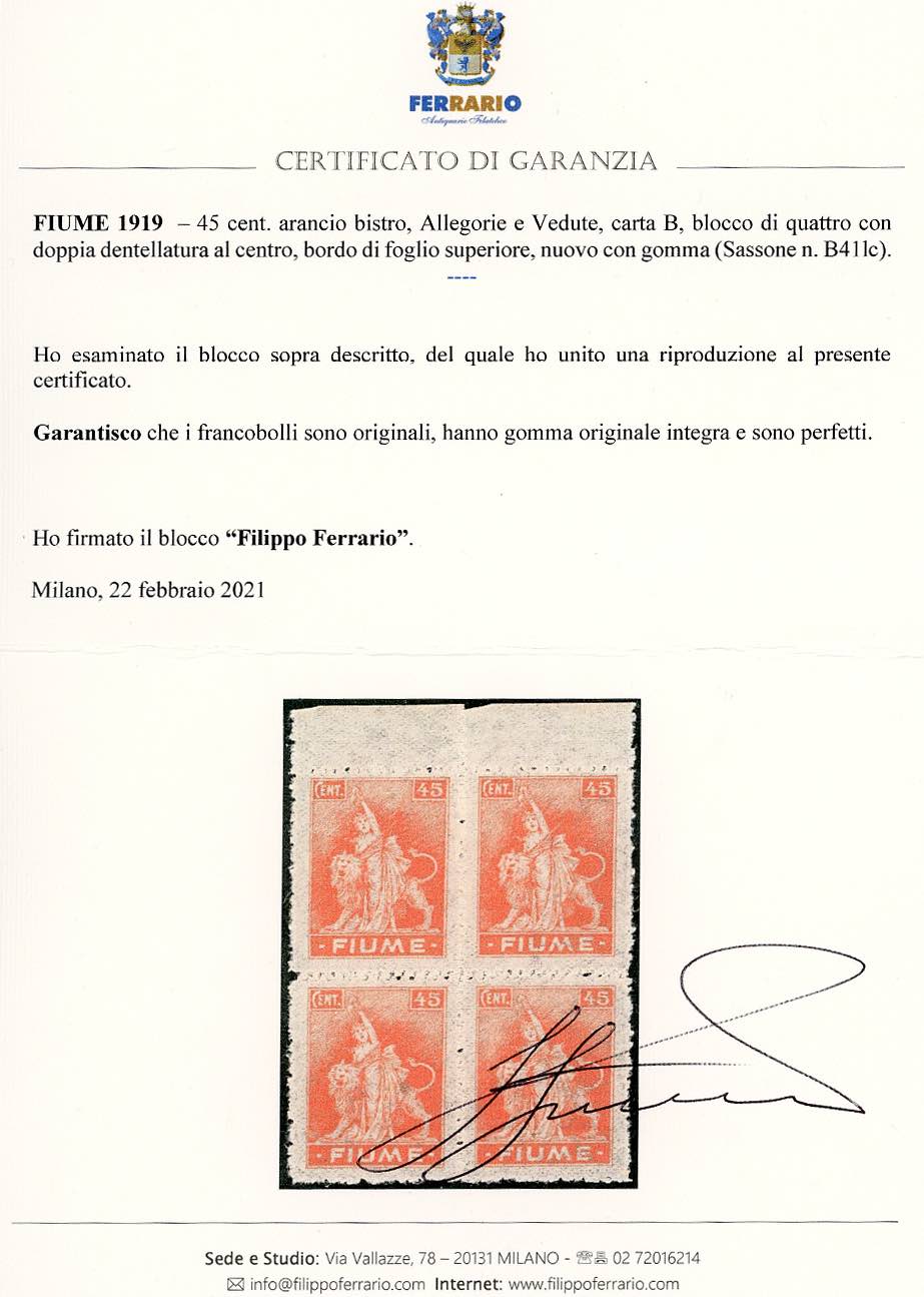 FIUME 1919 - 45 cent. Allegorie e vedute, carta B, blocco di quattro con doppia dentellatura al centro (B41lc), gomma integra, perfetto. Cert. Ferrario.