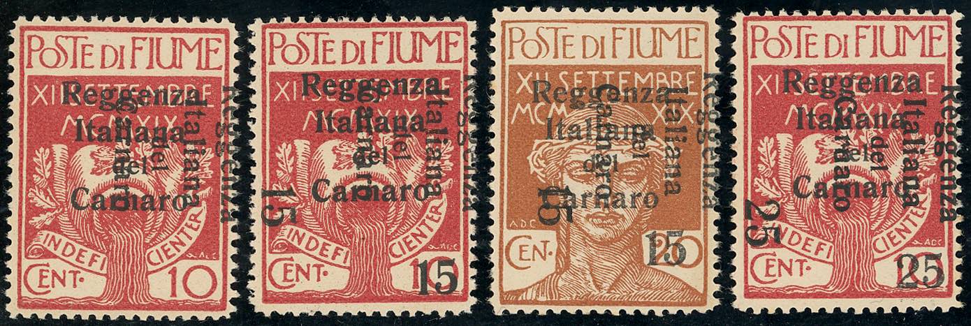 FIUME 1920 - Soprastampati "Reggenza Italiana del Carnaro", quattro esemplari con doppia soprastampa di cui una verticale dall'alto in basso (134f/136f,140f), gomma integra, perfetti. Raro insieme di ottima qualità.