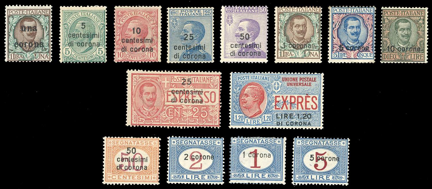 DALMAZIA 1919/1922 - L'emissione completa con espressi e segnatasse (1/8,E 1/2,S1/4), nuovi, gomma originale, integra per alcuni esemplari, perfetti. Molto freschi, ottima qualità.