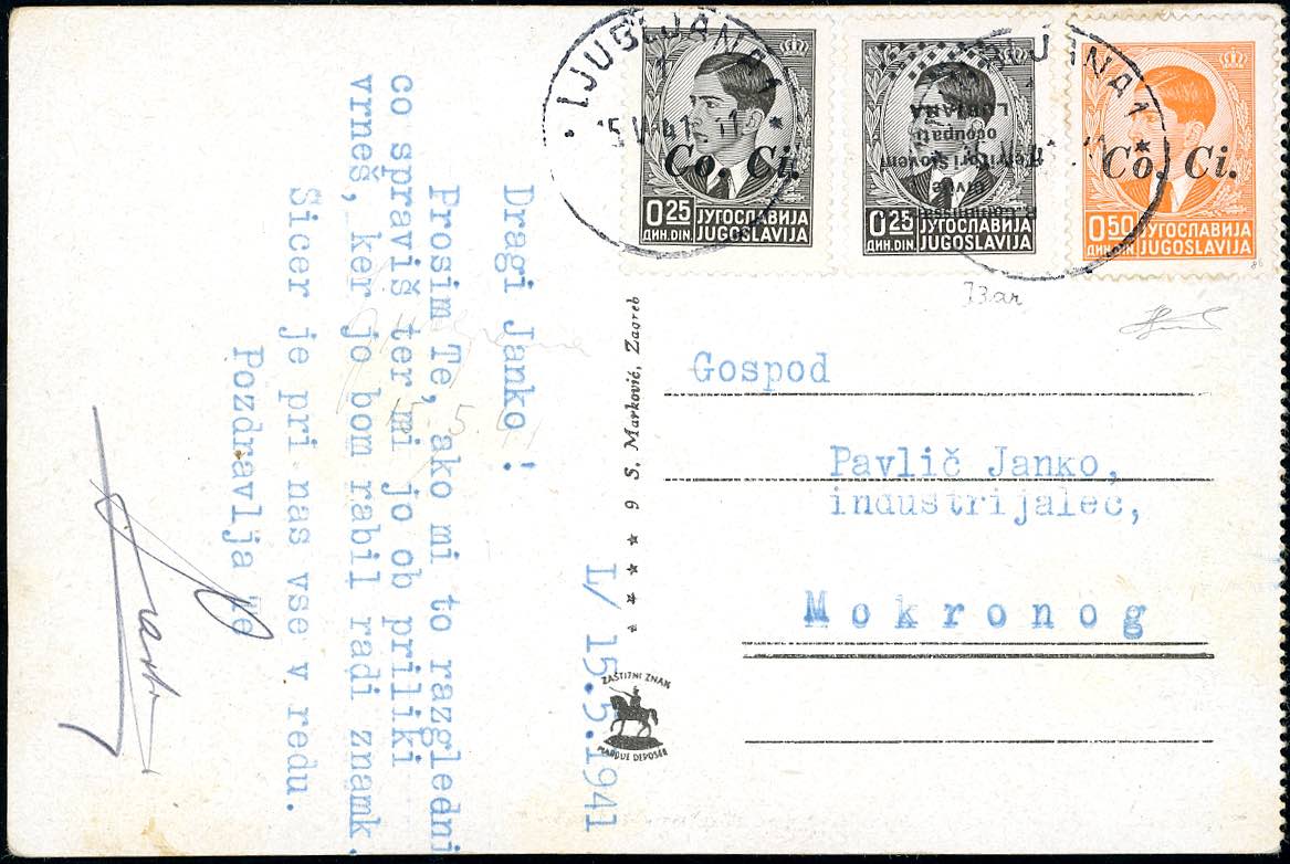 LUBIANA 1941 - 25 p. soprastampa "R. Commissariato" capovolta, 25 p. e 50 p. soprastampa a macchina "Co.Ci." (18a,1,2), perfetti, su cartolina da Lubiana 15/5/1941 per Mokronog. Bella combinazione di valori gemelli, impreziosita dall'uso nel primo giorno di emissione del francobollo con la varietà. Bar, Ferrario.