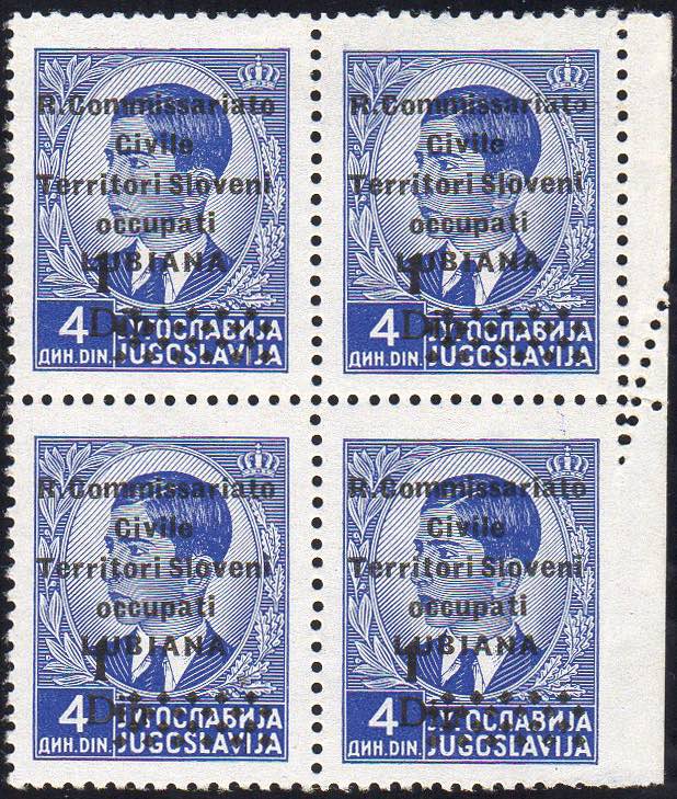 LUBIANA 1941 - 1 dinaro su 4 dinari (40), blocco di quattro con soprastampa spostata a destra, un esemplare non dentellato a destra, ... Leggi tutto