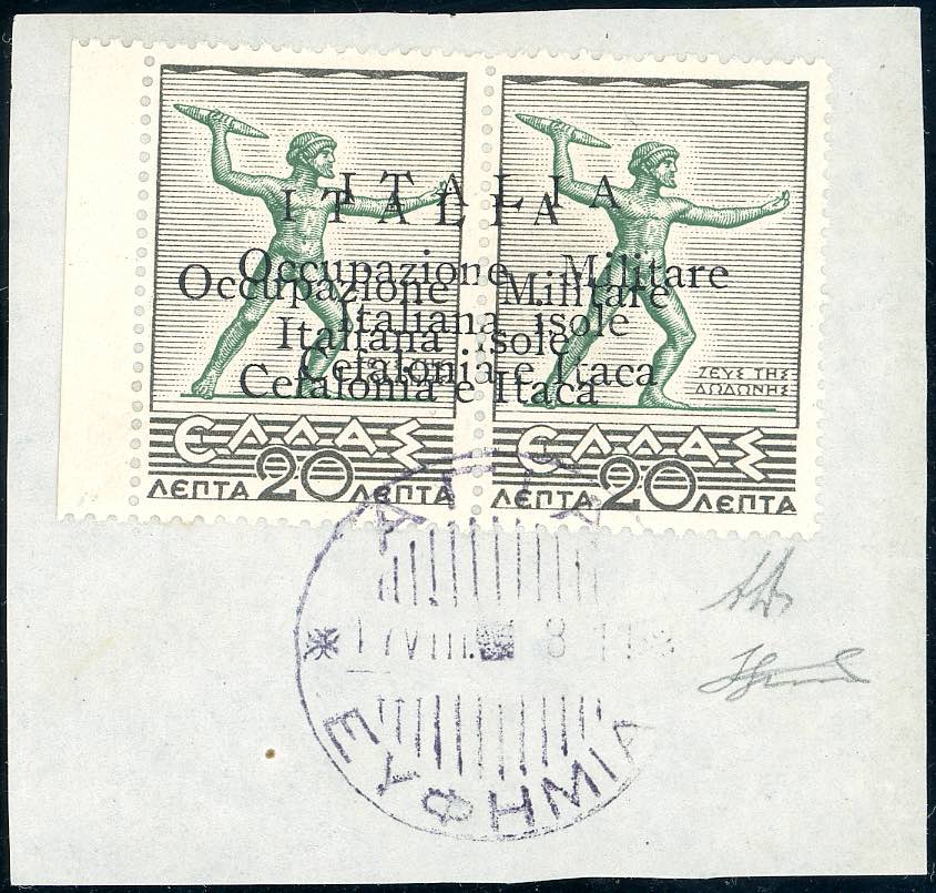 EMISSIONI DI ARGOSTOLI 1941 - 20 l. 20 l. Mitologica, doppia soprastampa (13f), perfetto, usato su frammento. A.Diena, Ferrario.