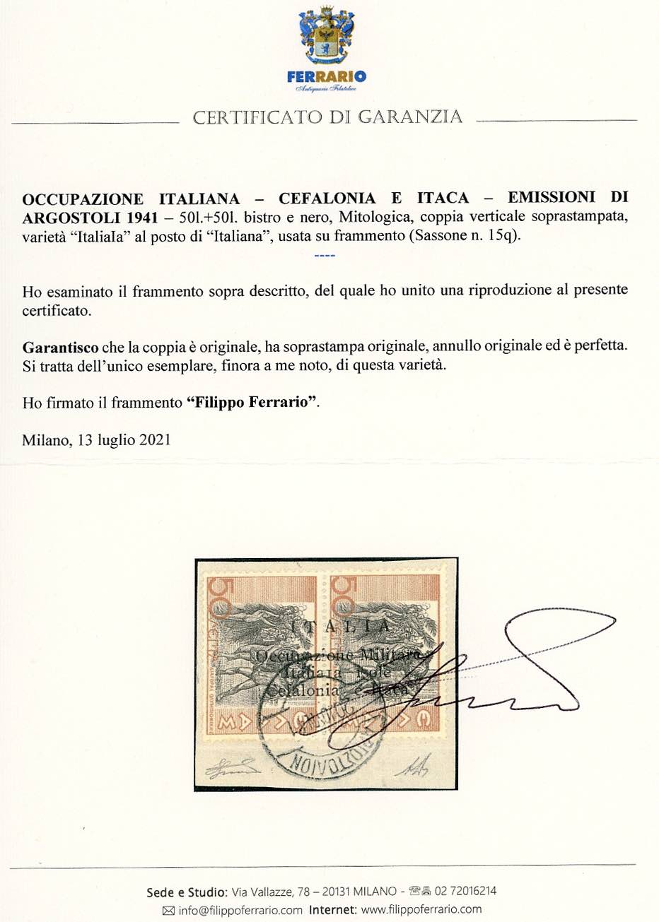 EMISSIONI DI ARGOSTOLI 1941 - 50 l. 50 l. Mitologica, varietà "ITALIAIA" al posto di "ITALIANA" (15q), usata, perfetto. Si tratta probabilmente dell'UNICO ESEMPLARE NOTO di questa varietà. A.Diena, cert. Ferrario.