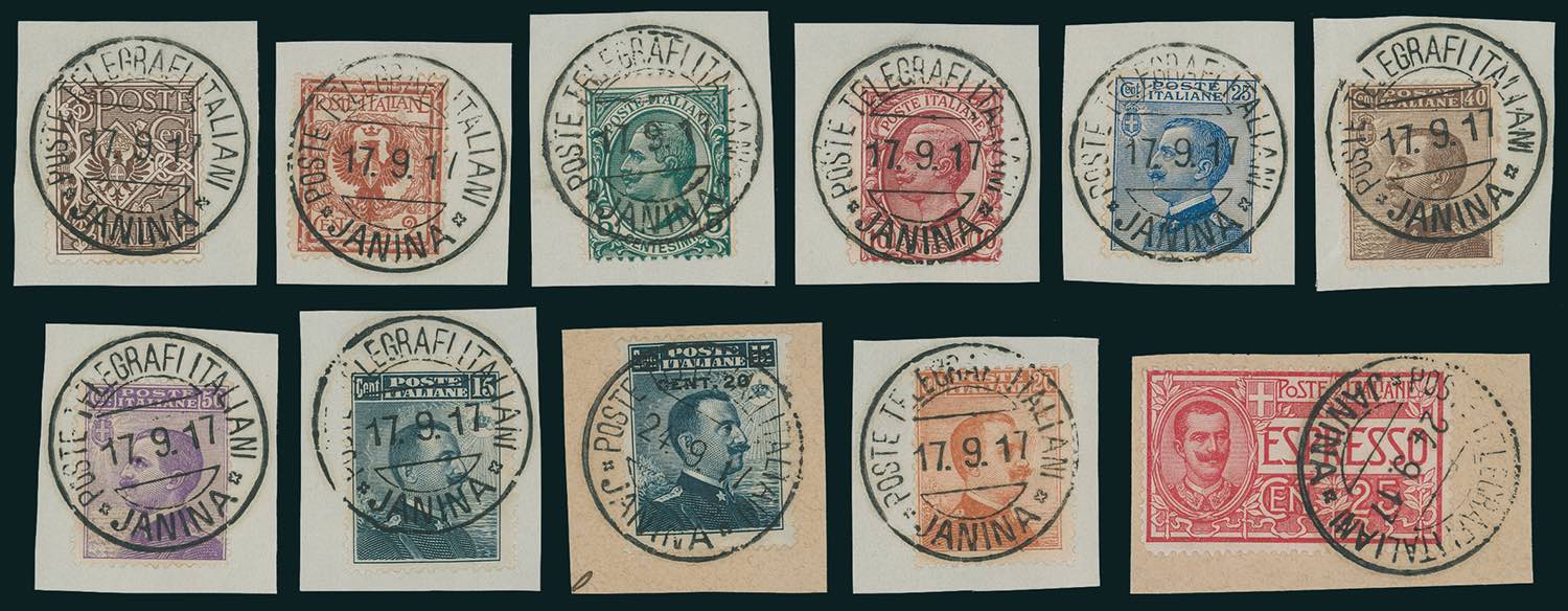 OCCUPAZIONE ITALIANA ALBANIA - JANINA 1917 - Floreale, Leoni, Michetti, espresso (68/69,81/82,83/85,96,106,109,E1), undici esemplari, perfetti, usati su frammento a Janina 17/9/1917. Ferrario.