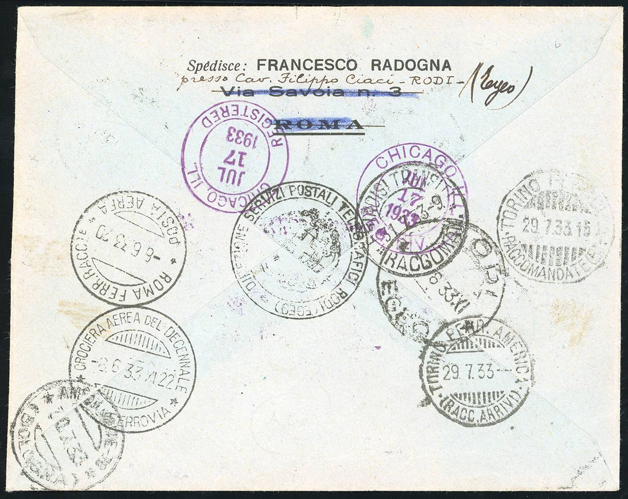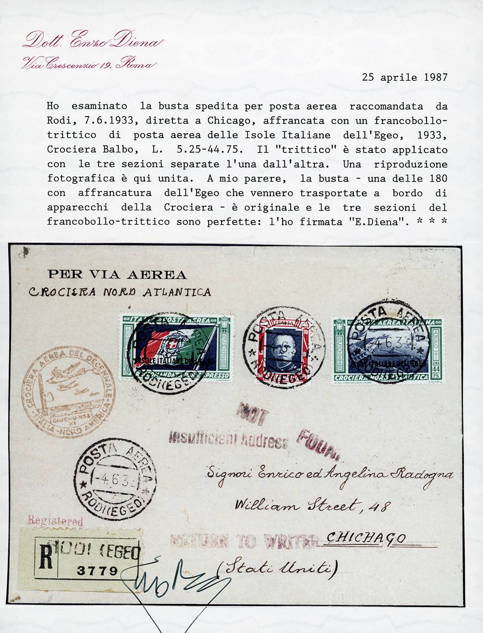 POSTA AEREA 1933 - 5,25 44,75 lire Trittico Crociera Nord Atlantica (29), applicato con sezioni separate, perfette, su aerogramma raccomandato da Rodi 4/6/1933 per Chicago U.S.A., rispedito al mittente, con bolli speciali. Delle 180 lettere trasportate con trittici dell'Egeo, questa è l'UNICA CON LE SEZIONI SEPARATE. Rarità. Ferrario, cert. E.Diena.
