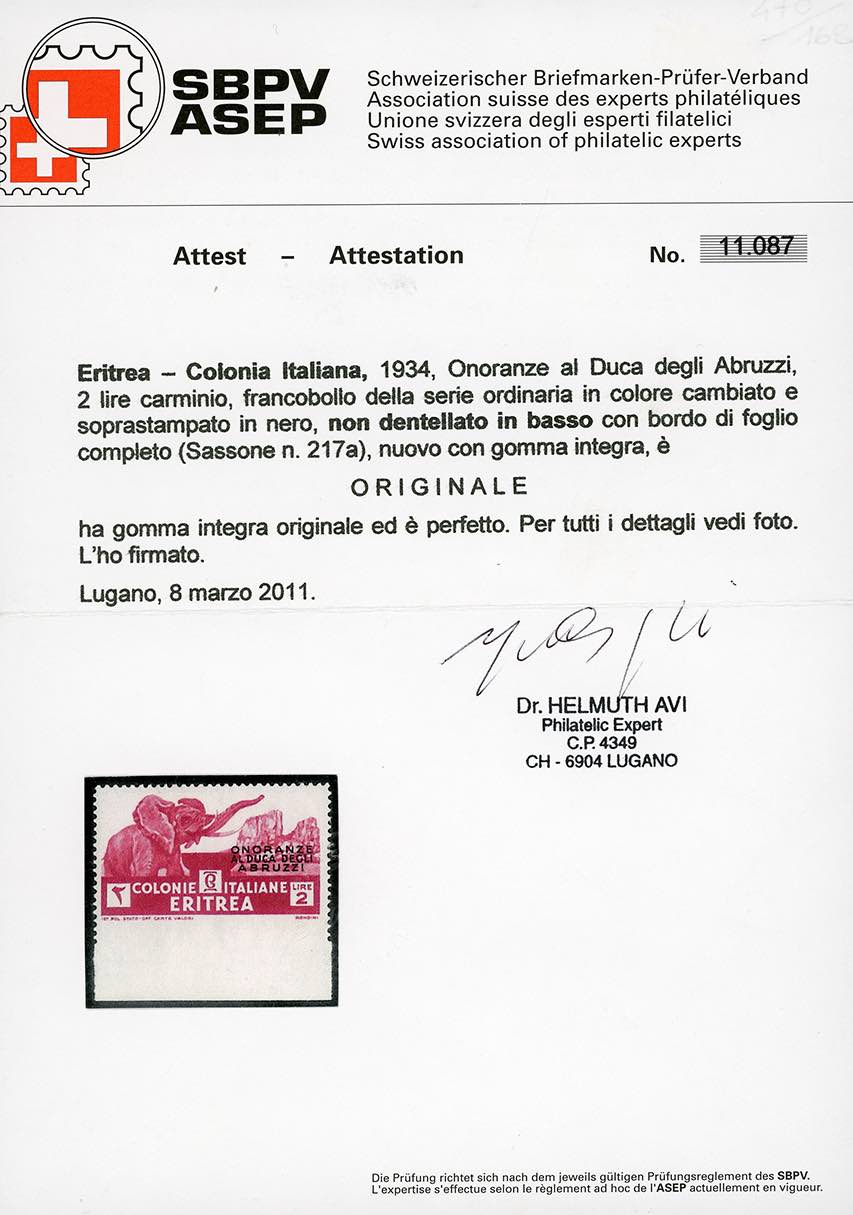 1934 - 2 lire Onoranze al Duca degli Abruzzi, non dentellato in basso (217a), gomma integra, perfetto. Raro! Cert. Avi.