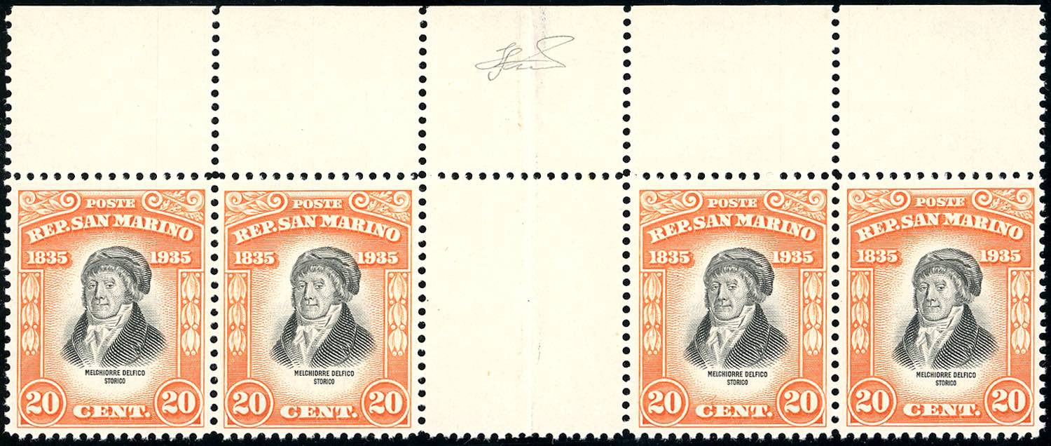 1935 - 20 cent. Delfico (197), striscia di quattro orizzontale con interspazio di gruppo al centro, gomma integra, perfetta. Ferrario.