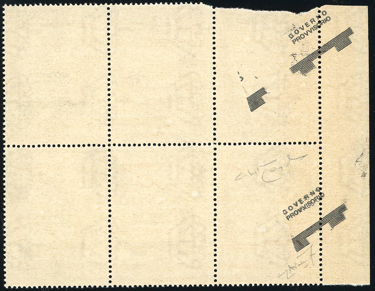 1943 - 25 cent. soprastampato "Governo Provvisorio", blocco di sei, due esemplari con la soprastampa solo al verso, uno senza soprastampa, ... Leggi tutto