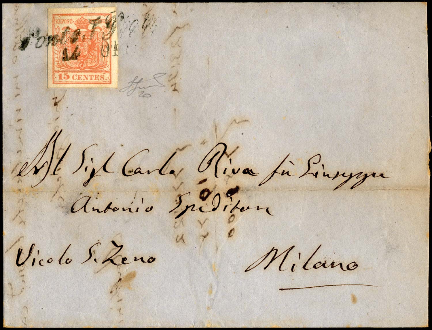 PONTE SAN PIETRO, Cor. azzurrastro, punti 8 - 15 cent. (20), perfetto, su lettera del 14/10/1857 per Milano. Ferrario.