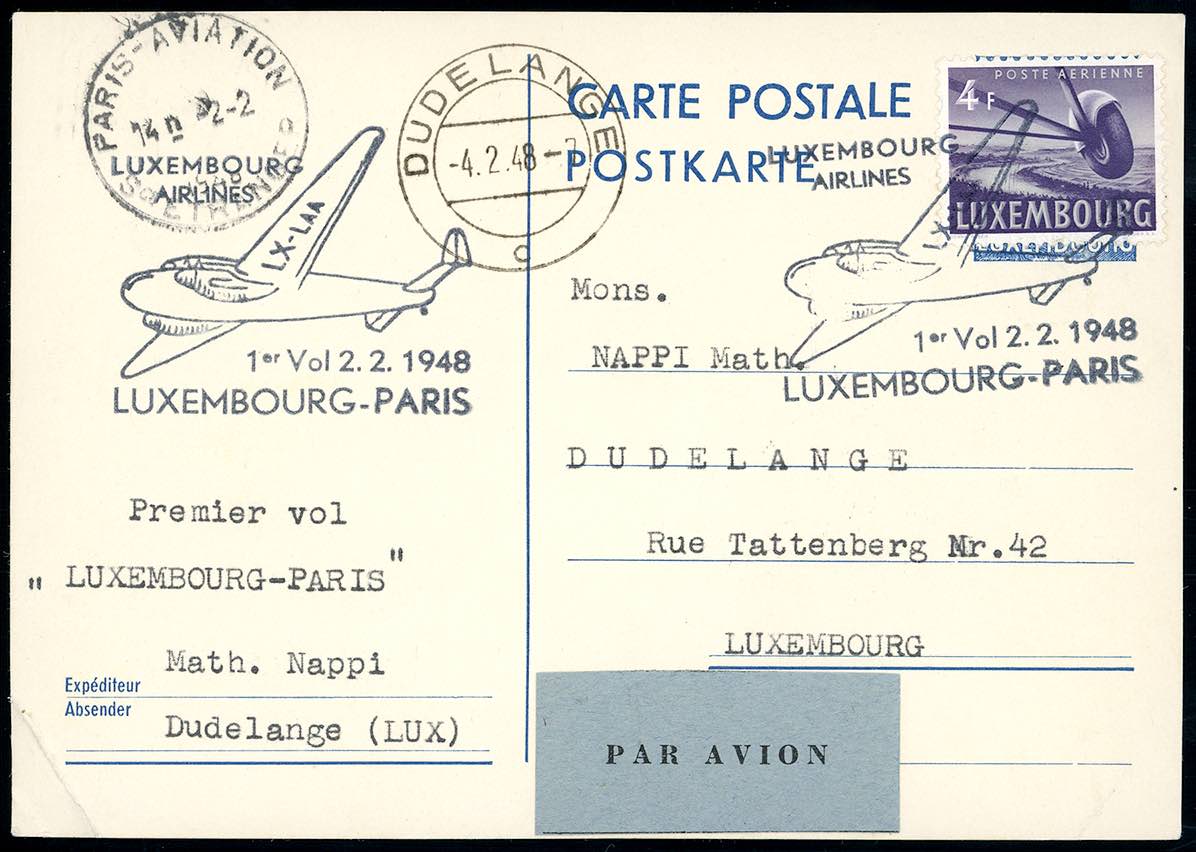LUSSEMBURGO POSTA AEREA 1948 - 4 fr. posta aerea (A10), perfetto su cartolina con i bolli speciali del I volo Lussemburgo-Parigi del 2/2/1948.